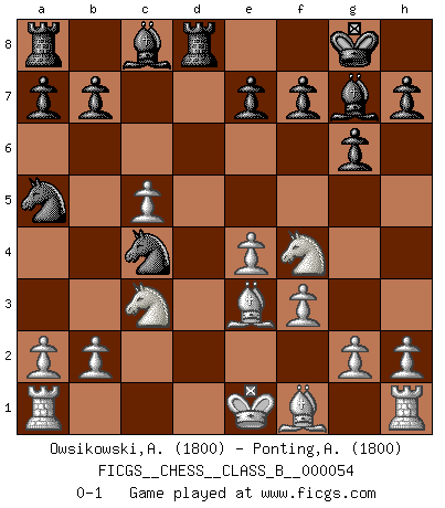 Last move : 0-1 2008 November 28 10:22:3 [Event "FICGS__CHESS__CLASS_B__000054"] [Site "FICGS"] [Date "2008.08.26"] [Round "1"] [White "Owsikowski,Andrzej"] [Black "Ponting,Andrew"] [Result "0-1"] [WhiteElo "1800"] [BlackElo "1800"] 1.d4 Nf6 2.c4 g6 3.Nc3 Bg7 4.e4 d6 5.f3 O-O 6.Be3 c5 7.dxc5 dxc5 8.Qxd8 Rxd8 9.Bxc5 Nc6 10.Nge2 Nd7 11.Be3 Nde5 12.Nf4 Na5 13.c5 Nec4 0-1 This chess game has been lost on time (started : 2008.08.26 12:19:16) King's Indian : Saemisch, 5...O-O Kingside Castling by player Black (move 5) Player Black won this chess game. Follow this game move after move (download)A man without frontiers. He didn't divide the East and the West, he brought them together in their admiration for him. (Ljubomir Ljubojevic, about Bobby Fischer's death) Privat ist Kortschnoi kein schlechter Mensch, sehr sympathisch. Aber während des Spiels ist er grausam. Er will dich töten. (Miguel Najdorf) Cada Peón es potencialmente una Reina. (James Mason) Les échecs, c'est la lutte contre l'erreur. (Johannes Zukertort) Games, world of games... There's always an opponent, and there's always a victim. (Revolver, movie)