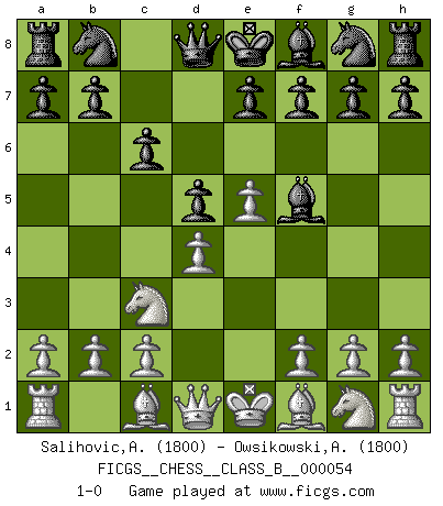 Last move : 1-0 2008 November 6 7:53:41 [Event "FICGS__CHESS__CLASS_B__000054"] [Site "FICGS"] [Date "2008.08.26"] [Round "1"] [White "Salihovic,Amar"] [Black "Owsikowski,Andrzej"] [Result "1-0"] [WhiteElo "1800"] [BlackElo "1800"] 1.e4 c6 2.d4 d5 3.e5 Bf5 4.Nc3 1-0 This chess game has been lost on time (started : 2008.08.26 12:19:16) Caro-Kann : Advance variation Player White won this chess game. Follow this game move after move (download)If cunning alone were needed to excel, women would be the best Chess players. (Albin) Es gibt nur zwei wahre Schachgenies - das andere war Wilhelm Steinitz, der Weltmeister von 1872 bis 1894. (Robert James Fischer) El Ajedrez es el gimnasio de la mente. (Blaise Pascal) Il n'y a pas de prix trop élevé au scalp de l'ennemi. (Koblentz) Art is the only way to run away without leaving home. (Twyla Tharp)