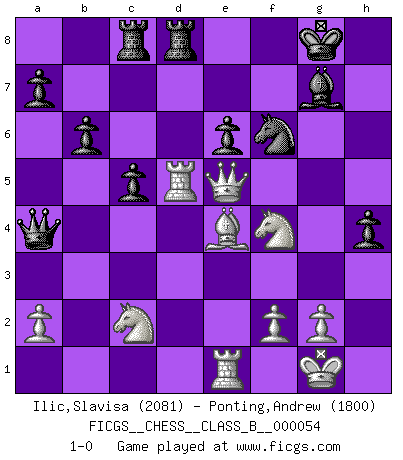 Last move : 1-0 2008 October 12 13:57:31 [Event "FICGS__CHESS__CLASS_B__000054"] [Site "FICGS"] [Date "2008.08.26"] [Round "1"] [White "Ilic,Slavisa"] [Black "Ponting,Andrew"] [Result "1-0"] [WhiteElo "2081"] [BlackElo "1800"] 1.d4 d5 2.c4 c6 3.Nc3 Nf6 4.Nf3 e6 5.Bg5 h6 6.Bxf6 Qxf6 7.e3 Nd7 8.Bd3 g6 9.e4 dxc4 10.e5 Qe7 11.Bxc4 Bg7 12.O-O O-O 13.Qe2 Rd8 14.Bd3 b6 15.h4 Bb7 16.Be4 Rac8 17.Rfe1 Nb8 18.Rad1 Na6 19.h5 gxh5 20.Nh2 h4 21.Ng4 Nc7 22.Qf3 Ne8 23.b4 h5 24.Ne3 Qxb4 25.Ne2 Ba6 26.Nc2 Qa4 27.Nf4 c5 28.Qxh5 f5 29.exf6 Nxf6 30.Qe5 Bc4 31.d5 Bxd5 32.Rxd5 1-0 QGD Slav defense Kingside Castling by player White (move 12) Kingside Castling by player Black (move 12) Player White won this chess game. Follow this game move after move (download)If your opponent offers you a draw, try to work out why he thinks he's worse off. (Nigel Short) Nach Morphy wurde nichts neues mehr in der Behandlung offener Positionen gefunden. (Mikhail Moiseyevich Botvinik) Debes de llevar a tu oponente hacia un profundo y obscuro bosque donde 2+2=5, y el camino que conduce a la salida es suficientemente ancho para solamente uno. (Mikhail Tal) A chaque perte on perd un peu de soi. (Joël Lautier) Computers make it easier to do a lot of things, but most of the things they make it easier to do don't need to be done. (Andy Rooney)