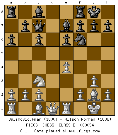 Last move : 0-1 2008 November 27 22:9:38 [Event "FICGS__CHESS__CLASS_B__000054"] [Site "FICGS"] [Date "2008.08.26"] [Round "1"] [White "Salihovic,Amar"] [Black "Wilson,Norman"] [Result "0-1"] [WhiteElo "1800"] [BlackElo "1806"] 1.d4 Nf6 2.Nf3 e6 3.g3 c5 4.Bg2 Qc7 5.O-O cxd4 6.Nxd4 a6 7.Nc3 Be7 8.e4 Nc6 9.Re1 O-O 10.Nxc6 dxc6 0-1 This chess game has been lost on time (started : 2008.08.26 12:19:16) Queen's pawn game Kingside Castling by player White (move 5) Kingside Castling by player Black (move 9) Player Black won this chess game. Follow this game move after move (download)Chess is a part of culture and if a culture is declining then Chess too will decline. (Mikhail Botvinnik) Das Schachspiel hat wie die Liebe, die Musik, die Fähigkeit, den Menschen glücklich zu machen. Ich habe ein leises Gefühl des Bedauerns für jeden, der das Schachspiel nicht kennt, so wie ich jeden bedaure, der die Liebe nicht kennt. (Siegbert Tarrasch) Coloca el contenido del tablero de Ajedrez en un sombrero, agita las piezas vigorosamente, derrámalas en el tablero desde una altura de medio metro y así obtienes el estilo de Wilhelm Steinitz. (H. E. Bird) J'apprécie les joueurs d'est-indienne, c'est grâce à eux que je nourris ma famille depuis tant d'années. (Petrosian) Fortune favours the audacious. (Desiderius Erasmus)