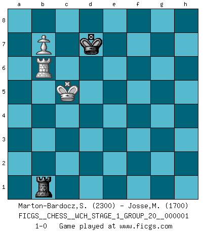 Last move : 1-0 2006 December 10 15:32:23 [Event "FICGS__CHESS__WCH_STAGE_1_GROUP_20__000001"] [Site "FICGS"] [Date "2006.08.04"] [Round "1"] [White "Marton-Bardocz,Sandor"] [Black "Josse,Mark"] [Result "1-0"] [WhiteElo "2300"] [BlackElo "1700"] 1.e4 c5 2.Nf3 d6 3.d4 cxd4 4.Nxd4 Nf6 5.Nc3 g6 6.Be3 Bg7 7.f3 Nc6 8.Qd2 O-O 9.Bc4 Bd7 10.Bb3 Rc8 11.h4 h5 12.O-O-O Ne5 13.Bg5 Rc5 14.g4 hxg4 15.f4 Nc4 16.Qe2 Qc8 17.Bxf6 Bxf6 18.Nd5 b5 19.h5 g5 20.Nxf6+ exf6 21.Qh2 Qc7 22.h6 Kh7 23.fxg5 fxg5 24.c3 d5 25.Qxc7 Rxc7 26.exd5 f5 27.Rde1 Nd6 28.Bc2 Bc8 29.Ne6 Bxe6 30.Rxe6 Nb7 31.Rf1 Rcf7 32.b4 Kh8 33.Rg6 f4 34.Rxg5 g3 35.Re1 Nd6 36.Re6 Rd8 37.Bd3 Rfd7 38.Reg6 a6 39.Rg4 Rf7 40.Rg7 Rdf8 41.R4g6 Nf5 42.Rxf7 Rxf7 43.d6 f3 44.Bxf5 Rxf5 45.d7 Rf8 46.Rf6 Rg8 47.h7 Rd8 48.Rxf3 g2 49.Rg3 Rxd7 50.Rxg2 Kxh7 51.Kc2 Rd6 52.Kb3 Rc6 53.Rg5 Kh6 54.Rc5 Rb6 55.a4 Kg6 56.axb5 axb5 57.c4 bxc4+ 58.Kxc4 Kf6 59.Rc7 Ke6 60.Kc5 Rb8 61.b5 Rh8 62.b6 Rh1 63.b7 Rb1 64.Rc6+ Kd7 65.Rb6 1-0 Sicilian : Dragon, Yugoslav attack Kingside Castling by player Black (move 8) Queenside Castling by player White (move 12) 10 pieces endgame at move 50 : White KRPPPP , Black KRPP WHITE : King + 1 Rook 4 Pawns BLACK : King + 1 Rook 2 Pawns 9 pieces endgame at move 50 : White KRPPP , Black KRPP WHITE : King + 1 Rook 3 Pawns BLACK : King + 1 Rook 2 Pawns 8 pieces endgame at move 56 : White KRPPP , Black KRP WHITE : King + 1 Rook 3 Pawns BLACK : King + 1 Rook 1 Pawn 7 pieces endgame at move 56 : White KRPP , Black KRP WHITE : King + 1 Rook 2 Pawns BLACK : King + 1 Rook 1 Pawn 6 pieces endgame at move 57 : White KRP , Black KRP WHITE : King + 1 Rook 1 Pawn BLACK : King + 1 Rook 1 Pawn 5 pieces endgame at move 58 : White KRP , Black KR WHITE : King + 1 Rook 1 Pawn BLACK : King + 1 Rook Player White won this chess game. Follow this game move after move (download)Whoever sees no other aim in the game than that of giving checkmate to one's opponent will never become a good Chess player. (Euwe) Ich glaube nicht an Psychologie, ich glaube an gute Züge. (Robert James Fischer) Los asuntos humanos son como una partida de Ajedrez: solo aquellos que no lo toman seriamente, pueden ser llamados buenos jugadores. (Hung Tzu Ch'eng) Des idées, des idées, j'en ai cent, j'en ai mille. Des bonnes, des mauvaises, applicables, irréalisables... Il suffit de faire le tri ! (Roos) Dave, my mind is going. I can feel it. (HAL 9000 in 2001, a space odyssey)