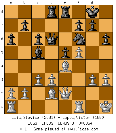 Last move : 0-1 2009 February 5 8:32:37 [Event "FICGS__CHESS__CLASS_B__000054"] [Site "FICGS"] [Date "2008.08.26"] [Round "1"] [White "Ilic,Slavisa"] [Black "Lopez,Victor"] [Result "0-1"] [WhiteElo "2081"] [BlackElo "1880"] 1.e4 e5 2.Nf3 Nf6 3.Nc3 Nc6 4.g3 Bc5 5.Bg2 d6 6.O-O O-O 7.d3 a6 8.h3 h6 9.Nh4 Nd4 10.Ne2 Kh7 11.c3 Nxe2+ 12.Qxe2 Kg8 13.Kh1 Be6 14.Nf5 Bxf5 15.exf5 c6 16.f4 Re8 17.fxe5 dxe5 18.Be4 Qd6 19.Bd2 Rad8 0-1 This chess game has been lost on time (started : 2008.08.26 12:19:16) Petrov Three knights game Kingside Castling by player White (move 6) Kingside Castling by player Black (move 6) Player Black won this chess game. Follow this game move after move (download)In blitz, the Knight is stronger than the Bishop. (Vlastimil Hort) Ich war schon mal beim Dopingtest. Da musste ich Urin abgeben, während Dritte zusahen. (Elisabeth Pähtz) Un Peón pasado es un criminal, quién debe ser mantenido bajo candado y llave. Leves medidas, tales como vigilancia policiaca, no son suficientes. (Aaron Nimzovich) Le moment que je préfère le plus dans une rencontre, c'est celui où je sens que la personnalité de l'adversaire se brise. (Robert Fischer) Knowledge will give you power, but character respect. (Bruce Lee)