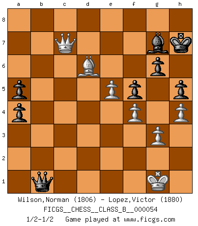 Last move : 1/2-1/2 2009 January 21 8:26:3 [Event "FICGS__CHESS__CLASS_B__000054"] [Site "FICGS"] [Date "2008.08.26"] [Round "1"] [White "Wilson,Norman"] [Black "Lopez,Victor"] [Result "1/2-1/2"] [WhiteElo "1806"] [BlackElo "1880"] 1.d4 Nf6 2.c4 g6 3.Nc3 d5 4.cxd5 Nxd5 5.e4 Nxc3 6.bxc3 Bg7 7.Nf3 c5 8.Rb1 O-O 9.Be2 Nc6 10.d5 Ne5 11.Qc2 Nxf3+ 12.Bxf3 Qa5 13.Bd2 b5 14.O-O Bd7 15.Rfc1 Qc7 16.g3 Rab8 17.Be3 Rfc8 18.Be2 Rb6 19.Kg2 a5 20.h4 h5 21.f4 Rb7 22.Qd2 Rd8 23.a4 bxa4 24.Rxb7 Qxb7 25.Bxc5 e6 26.c4 Rc8 27.Bd6 exd5 28.cxd5 Rxc1 29.Qxc1 f5 30.e5 Be6 31.Bc4 Bxd5+ 32.Kh2 Qc6 33.Bxd5+ Qxd5 34.Qc2 Qb3 35.Qc8+ Kh7 36.Qc7 Qa2+ 37.Kg1 Qb1+ 1/2-1/2 King's Indian defense, 3.Nc3 Kingside Castling by player Black (move 8) Kingside Castling by player White (move 14) This chess game ended in a draw. Follow this game move after move (download)One bad move nullifies forty good ones. (Horowitz) Nicht daß Diemer aus Opportunismus Mitglied der NSDAP geworden wäre. Er war ein Fanatiker, in allem, was er tat. (Hans Ree) No hay precio que no valga la pena por la cabellera del Rey enemigo. (Koblentz) Karpov est une pièce de musée. (Garry Kasparov) Thibault, I ask for draw. Game 13876. - Sorry Ilmars, you won. (FICGS chat)