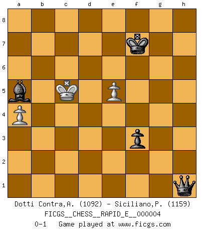 Last move : 0-1 2008 November 22 17:33:41 [Event "FICGS__CHESS__RAPID_E__000004"] [Site "FICGS"] [Date "2008.08.26"] [Round "1"] [White "Dotti Contra,Alessandro"] [Black "Siciliano,Pablo"] [Result "0-1"] [WhiteElo "1092"] [BlackElo "1159"] 1.e4 c5 2.Nf3 e6 3.Bb5 a6 4.Ba4 b5 5.Nc3 bxa4 6.Nxa4 Nc6 7.d4 cxd4 8.Nxd4 Qa5+ 9.c3 Nxd4 10.Qxd4 e5 11.Qc4 Qb5 12.Qxb5 axb5 13.Nb6 Rb8 14.Be3 Nf6 15.f3 Bd6 16.O-O Bc7 17.Nxc8 Rxc8 18.b3 O-O 19.Bc5 Rfe8 20.a4 bxa4 21.bxa4 Ba5 22.c4 Rxc5 23.Rfc1 Rec8 24.Ra2 Bb6 25.Kf1 Rxc4 26.Re1 Rc2 27.Rxc2 Rxc2 28.Re2 Rc1+ 29.Re1 Rxe1+ 30.Kxe1 Ba5+ 31.Ke2 d5 32.Ke3 d4+ 33.Kd3 Ne8 34.g3 Nd6 35.h4 h5 36.g4 g6 37.g5 f6 38.gxf6 g5 39.hxg5 h4 40.g6 h3 41.f7+ Nxf7 42.gxf7+ Kxf7 43.f4 exf4 44.Kxd4 h2 45.e5 h1Q 46.Kc5 f3 0-1 Sicilian defense Kingside Castling by player White (move 16) Kingside Castling by player Black (move 18) 10 pieces endgame at move 42 : White KPPPP , Black KBPPP WHITE : King + 4 Pawns BLACK : King + 1 Bishop 3 Pawns 9 pieces endgame at move 42 : White KPPP , Black KBPPP WHITE : King + 3 Pawns BLACK : King + 1 Bishop 3 Pawns 8 pieces endgame at move 43 : White KPP , Black KBPPP WHITE : King + 2 Pawns BLACK : King + 1 Bishop 3 Pawns 7 pieces endgame at move 44 : White KPP , Black KBPP WHITE : King + 2 Pawns BLACK : King + 1 Bishop 2 Pawns Promotion Queen by player Black (move 45) Player Black won this chess game. Follow this game move after move (download)Do you realize Fischer almost never has any bad pieces? He exchanges them, and the bad pieces remain with his opponents. (Yuri Balashov) Wenn Spassky eine Figur opfert kannst du genauso gut aufgeben. Aber wenn Tal eine Figur opfert, spiel weiter. Er könnte noch eine weitere opfern, und dann ... wer weiß? (Miguel Najdorf) Todavía soy una víctima del Ajedrez. Tiene toda la belleza del arte y mucho mas. No puede ser comercializado. El Ajedrez es mas puro que el arte en su posición social. (Marcel Duchamp) Les Cavaliers se révèlent fort utiles dans les positions fermées. D'habitude, les Fous sont un peu plus forts que les Cavaliers dans les positions ouvertes. Qu'on le veuille ou non, il restera toujours des exceptions ! You lose, general Kenobi. (General Grievous in Star Wars ep.3)