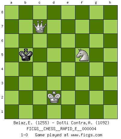 Last move : 1-0 2009 January 23 21:44:32 [Event "FICGS__CHESS__RAPID_E__000004"] [Site "FICGS"] [Date "2008.08.26"] [Round "1"] [White "Belaz,Egidio"] [Black "Dotti Contra,Alessandro"] [Result "1-0"] [WhiteElo "1255"] [BlackElo "1092"] 1.e4 Nc6 2.Nf3 e5 3.Bc4 Nh6 4.O-O Bc5 5.d4 Bxd4 6.c3 Bc5 7.Bxh6 gxh6 8.Bxf7+ Kxf7 9.Qd5+ Kf6 10.Qxc5 d6 11.Qe3 Qf8 12.Nh4 Be6 13.f4 Bc4 14.Rf2 Qe8 15.fxe5+ Ke6 16.Qxh6+ Kd7 17.Na3 Be6 18.exd6 cxd6 19.Raf1 Qe7 20.Qf6 Qxf6 21.Rxf6 Bg4 22.R1f2 Rae8 23.h3 Rxe4 24.R6f4 Re2 25.hxg4 Re1+ 26.Rf1 Rhe8 27.Rf7+ R1e7 28.Nb5 Rxf7 29.Rxf7+ Re7 30.Rxe7+ Kxe7 31.Nf5+ Kd7 32.Nbxd6 Kc7 33.b4 a6 34.b5 Ne5 35.bxa6 bxa6 36.g5 Kd7 37.Ne4 Ke6 38.Nd4+ Kd5 39.Nf6+ Kc4 40.Ne2 a5 41.Nxh7 Ng6 42.g3 a4 43.Kf1 Ne5 44.Nf8 Nf7 45.g6 Nh6 46.Ke1 Kd3 47.a3 Kc4 48.Kd2 Kb3 49.Nc1+ Kxa3 50.Kc2 Nf5 51.Ne2 Ne3+ 52.Kd3 Ng4 53.g7 Nh6 54.g4 Kb3 55.Nc1+ Kb2 56.Kd2 a3 57.g5 Ng8 58.Ne6 a2 59.Nxa2 Kxa2 60.c4 Kb3 61.c5 Kc4 62.c6 Kd5 63.c7 Ne7 64.c8Q Nxc8 65.g8Q Ne7 66.Qf7 Kd6 67.g6 Nxg6 68.Qxg6 Ke5 69.Ng7 Kd5 70.Qe6+ Kd4 71.Nf5+ Kc5 72.Qd6+ Kb5 73.Qc7 1-0 KP : Nimzovich defense Kingside Castling by player White (move 4) 10 pieces endgame at move 41 : White KNNPPPP , Black KNP WHITE : King + 2 Knights 4 Pawns BLACK : King + 1 Knight 1 Pawn 9 pieces endgame at move 49 : White KNNPPP , Black KNP WHITE : King + 2 Knights 3 Pawns BLACK : King + 1 Knight 1 Pawn 8 pieces endgame at move 59 : White KNNPPP , Black KN WHITE : King + 2 Knights 3 Pawns BLACK : King + 1 Knight 7 pieces endgame at move 59 : White KNPPP , Black KN WHITE : King + 1 Knight 3 Pawns BLACK : King + 1 Knight Promotion Queen by player White (move 64) 6 pieces endgame at move 64 : White KNPP , Black KN WHITE : King + 1 Knight 2 Pawns BLACK : King + 1 Knight Promotion Queen by player White (move 65) 5 pieces endgame at move 67 : White KQN , Black KN WHITE : King + 1 Queen 1 Knight BLACK : King + 1 Knight 4 pieces endgame at move 68 : White KQN , Black K WHITE : King + 1 Queen 1 Knight BLACK : King + Player White won this chess game. Follow this game move after move (download)If you aren't afraid of Spassky, then I have removed the element of money. (Jim Slater) Wenn ich gewinne bin ich ein Genie. Wenn nicht, dann bin ich keines. (Robert James Fischer) Hoy en día, si tu no eres un Gran Maestro a los 14 años, es mejor que lo olvides. (Anand Viswanathan) La vérité est comme le meilleur coup aux échecs : elle existe, mais il faut la chercher. (Arturo Perez-Reverte) Philosophers use a language that is already deformed as though by shoes that are too tight. (Ludwig Wittgenstein)