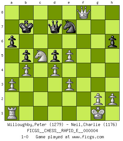 Last move : 1-0 2008 September 23 13:10:16 [Event "FICGS__CHESS__RAPID_E__000004"] [Site "FICGS"] [Date "2008.08.26"] [Round "1"] [White "Willoughby,Peter"] [Black "Neil,Charlie"] [Result "1-0"] [WhiteElo "1279"] [BlackElo "1176"] 1.d4 e6 2.Nf3 Nf6 3.e3 c5 4.b3 Nc6 5.c3 cxd4 6.cxd4 Qa5+ 7.Bd2 Bb4 8.Bd3 Bxd2+ 9.Nbxd2 d5 10.O-O h6 11.a3 a6 12.Ne5 Qc7 13.f4 Nd7 14.Qg4 b5 15.Qxg7 Rf8 16.Bh7 Ndxe5 17.fxe5 Bd7 18.Bg8 O-O-O 19.Bxf7 Qa5 20.b4 Qc7 21.Rf6 Ne7 22.Nb3 Be8 23.Bxe6+ Bd7 24.Bxd7+ Qxd7 25.Rxf8 Rxf8 26.Qxf8+ Kb7 27.Nc5+ 1-0 Queen's pawn Kingside Castling by player White (move 10) Queenside Castling by player Black (move 18) Player White won this chess game. Follow this game move after move (download)It is not a move, even the best move that you must seek, but a realizable plan. (Eugene Znosko-Borovsky) Kann Schach nicht schließlich das Nationalspiel der Deutschen werden? Und welche weiteren Ausblicke bieten sich dann dar! Welche Hebung des allgemeinen Kultur-Niveaus, ja der Moral, wenn das Schachbrett den Kartentisch verdrängen würde! Wahrlich, ein Ziel, des Schweißes der Edlen wert! (Siegbert Tarrasch) Aquellos que dicen que entienden al Ajedrez, no entienden nada. (Robert Hubner) La menace est plus forte que l'exécution. (Aaron Nimzovitch) In God we trust, all others we virus scan. (Anonymous)
