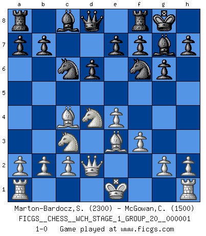 Last move : 1-0 2006 October 10 11:49:43 [Event "FICGS__CHESS__WCH_STAGE_1_GROUP_20__000001"] [Site "FICGS"] [Date "2006.08.04"] [Round "1"] [White "Marton-Bardocz,Sandor"] [Black "McGowan,Chase"] [Result "1-0"] [WhiteElo "2300"] [BlackElo "1500"] 1.e4 c5 2.Nf3 d6 3.d4 cxd4 4.Nxd4 g6 5.Be3 Bg7 6.Nc3 Nc6 7.Qd2 Nf6 8.f3 O-O 9.Bc4 1-0 This chess game has been lost on time (started : 2006.08.04 14:29:32) Sicilian Kingside Castling by player Black (move 8) Player White won this chess game. Follow this game move after move (download)A bad plan is better than none at all. (Frank Marshall) Dein Körper muss in Topform sein. Dein Schach verfällt, wenn dein Körper verfällt. Der Körper kann nicht vom Geist getrennt werden. (Robert James Fischer) Un juego de Ajedrez es un dialogo, una conversación entre un jugador y su oponente. Cada movimiento del oponente puede contener amenazas o tropiezos, pero un jugador no se puede defender de las amenazas o tomar ventaja de los tropiezos si es que no se pregunta a sí mismo: ¿Que es lo que mi oponente va a hacer después de cada movida?. (Bruce A. Moon) C'est la seule position que je connaisse où les deux camps sont mals. Propos prêtés à V. Anand. A clear conscience is usually the sign of a bad memory. (Unknown)