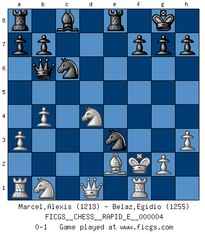 Last move : 0-1 2008 September 3 10:2:57 [Event "FICGS__CHESS__RAPID_E__000004"] [Site "FICGS"] [Date "2008.08.26"] [Round "1"] [White "Marcel,Alexis"] [Black "Belaz,Egidio"] [Result "0-1"] [WhiteElo "1213"] [BlackElo "1255"] 1.f4 c5 2.Nf3 d6 3.e3 Nf6 4.Be2 e6 5.O-O Be7 6.b3 O-O 7.Bb2 Nc6 8.h3 Re8 9.d3 Qb6 10.Nbd2 Nd5 11.Kf2 Bf6 12.Bxf6 Nxf6 13.a3 Nd5 14.Nb1 c4 15.d4 cxb3 16.cxb3 e5 17.fxe5 dxe5 18.b4 exd4 19.Nxd4 Nxe3 0-1 Bird's Opening Kingside Castling by player White (move 5) Kingside Castling by player Black (move 6) Player Black won this chess game. Follow this game move after move (download)Chess is as much a mystery as women. (Purdy) Eine Person mit durchschnittlichem IQ kann etwa eine ELO von 2000 erreichen. (Jonathan Levitt) Siempre es mejor sacrificar los hombres de tu oponente. (Savielly Tartakower) Pour moi, les échecs ne sont pas un jeu mais un art. (Alexandre Alekhine) Good decisions come from experience, and experience comes from bad decisions. (Anonymous)