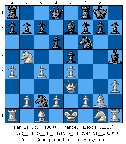 Last move : 0-1 2008 September 26 3:30:39 [Event "FICGS__CHESS__NO_ENGINES_TOURNAMENT__000010"] [Site "FICGS"] [Date "2008.08.29"] [Round "1"] [White "Harris,Cal"] [Black "Marcel,Alexis"] [Result "0-1"] [WhiteElo "1800"] [BlackElo "1213"] 1.e4 e5 2.c4 Nf6 3.Nc3 d6 4.a4 Be7 5.Qf3 O-O 6.g4 Bxg4 7.Qe3 Nc6 8.h3 Bh5 9.Bg2 Nd4 10.Nb5 Nc2+ 0-1 King's pawn game Kingside Castling by player Black (move 5) Player Black won this chess game. Follow this game move after move (download)It's always better to sacrifice your opponent's men. (Savielly Tartakover) Der Vorposten provoziert a) eine Basis für neue Angriffe und b) eine Schwächung der gegnerischen Widerstandskraft in der fraglichen Linie. (Aaron Nimzowitsch) Cuando estes solo, cuando te sientas un extraño en el mundo, juega al Ajedrez. Esto levantará tu espiritu y será tu consejero de guerra. (Aristóteles) Un footballeur joue avec ses pieds, parfois avec sa tête. Un joueur d'échecs ne joue qu'avec sa tête. Et quand il ne joue plus, il meurt. (Jacob Murray) Man is reluctant to give credit for intelligence to anyone, except his enemies. (Albert Einstein)