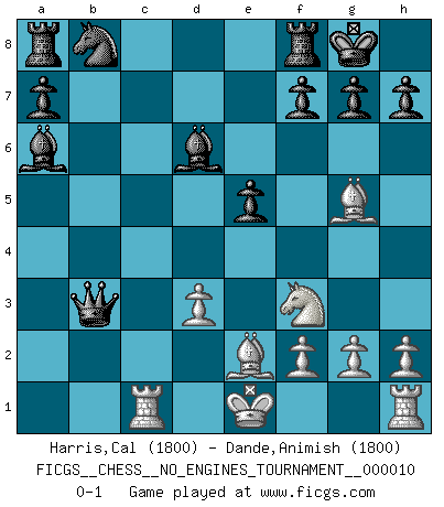 Last move : 0-1 2008 September 26 3:36:56 [Event "FICGS__CHESS__NO_ENGINES_TOURNAMENT__000010"] [Site "FICGS"] [Date "2008.08.29"] [Round "1"] [White "Harris,Cal"] [Black "Dande,Animish"] [Result "0-1"] [WhiteElo "1800"] [BlackElo "1800"] 1.e4 e5 2.c4 Nf6 3.Nc3 c6 4.Nf3 d5 5.exd5 cxd5 6.cxd5 Nxd5 7.Nxd5 Qxd5 8.d3 Bd6 9.Qa4+ b5 10.Bg5 bxa4 11.Be2 O-O 12.b3 axb3 13.axb3 Qxb3 14.Rc1 Ba6 0-1 King's pawn game Kingside Castling by player Black (move 11) Player Black won this chess game. Follow this game move after move (download)Chess is a matter of delicate judgment, knowing when to punch and how to duck. (Bobby Fischer) Mein erstes Ziel war nicht, die Partie zu gewinnen, sondern eine Figur zu opfern. -- der junge (Wilhelm Steinitz) Solo los afeminados hacen el Enroque. (Rob Sillars) On croit qu'il y a plus de mauvais joueurs que de bons joueurs, c'est faux : Il y a autant de joueurs qui gagnent que de joueurs qui perdent. (Philippe Geluck) The good fighters of old first put themselves beyond the possibility of defeat, and then waited for an opportunity of defeating the enemy. (Sun Tzu)
