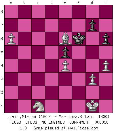 Last move : 1-0 2009 January 24 1:41:6 [Event "FICGS__CHESS__NO_ENGINES_TOURNAMENT__000010"] [Site "FICGS"] [Date "2008.08.29"] [Round "1"] [White "Jerez,Miriam"] [Black "Martinez,Silvio"] [Result "1-0"] [WhiteElo "1800"] [BlackElo "1800"] 1.d4 d5 2.Nf3 Nc6 3.Nc3 Nf6 4.g3 e6 5.Bh3 Bb4 6.Bd2 O-O 7.O-O h6 8.a3 Bxc3 9.Bxc3 b6 10.e3 Ba6 11.b4 Bxf1 12.Bxf1 Ne4 13.Qd3 Nxc3 14.Qxc3 f6 15.Qxc6 Qd6 16.Qxd6 cxd6 17.c3 a5 18.bxa5 Rxa5 19.h4 e5 20.c4 dxc4 21.Bxc4+ Kh8 22.dxe5 dxe5 23.Nd2 b5 24.Nb3 Ra7 25.Bxb5 f5 26.a4 f4 27.a5 Rb8 28.Bc4 fxg3 29.fxg3 Rb4 30.Be6 Ra6 31.Nc5 Rc6 32.Rc1 Rg4 33.Bxg4 Kg8 34.a6 Rc7 35.e4 Kf7 36.Be6+ Kf6 37.Nd3 Rxc1+ 38.Nxc1 1-0 Queen's pawn game, Chigorin variation Kingside Castling by player Black (move 6) Kingside Castling by player White (move 7) Player White won this chess game. Follow this game move after move (download)The older I grow, the more I value Pawns. (Keres) Die meiste Zeit treffe ich auf Gegner, die meine Enkel sein könnten. Ich bin da, um ihnen zu zeigen, dass sie von mir noch einiges lernen können. (Viktor Kortschnoi) Vive, pierde y aprende al observar a tu oponente como ganar. (Amber Steenbock) On a dit que l'homme se distingue de l'animal par le fait qu'il achète plus de livres qu'il ne peut en lire. Je voudrais suggérer qu'inclure à la liste des livres quelques livres d'échecs rendrait la distinction manifeste. (Edward Lasker) May I never be complete. May I never be content. May I never be perfect. Deliver me, Tyler, from being perfect and complete. (Chuck Palahniuk, Fight Club)