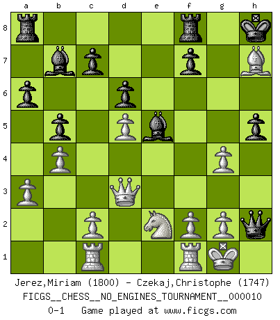 Last move : 0-1 2009 February 19 0:27:23 [Event "FICGS__CHESS__NO_ENGINES_TOURNAMENT__000010"] [Site "FICGS"] [Date "2008.08.29"] [Round "1"] [White "Jerez,Miriam"] [Black "Czekaj,Christophe"] [Result "0-1"] [WhiteElo "1800"] [BlackElo "1747"] 1.d4 g6 2.e4 Bg7 3.Nf3 d6 4.Nc3 a6 5.Bd3 Nd7 6.O-O b5 7.d5 Ngf6 8.b4 O-O 9.Ne2 Bb7 10.Rb1 Ng4 11.h3 Nge5 12.Nxe5 Nxe5 13.Bb2 e6 14.a3 exd5 15.exd5 Qh4 16.Bxe5 Bxe5 17.Rc1 g5 18.Bf5 h5 19.Qd3 g4 20.Bh7+ Kh8 21.hxg4 Qh2+ 0-1 Modern defense Kingside Castling by player White (move 6) Kingside Castling by player Black (move 8) Player Black won this chess game. Follow this game move after move (download)Chess is ruthless: you've got to be prepared to kill people. (Nigel Short) Wenn du nicht weißt was du tun sollst, warte bis dein Gegner eine Idee hat. Sie wird sicher schlecht sein. (Siegbert Tarrasch) El Ajedrez es parte de una cultura y si una cultura esta en decadencia, entonces también el Ajedrez declinará. (Mikhail Botvinnik) Même si vous avez un bon coup à faire, regardez toujours s'il n'y en a pas un qui lui soit préférable. (Pedro Damiano) If things go wrong, don't go with them. (Roger Babson)