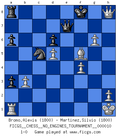 Last move : 1-0 2008 November 30 17:31:29 [Event "FICGS__CHESS__NO_ENGINES_TOURNAMENT__000010"] [Site "FICGS"] [Date "2008.08.29"] [Round "1"] [White "Bromo,Alexis"] [Black "Martinez,Silvio"] [Result "1-0"] [WhiteElo "1800"] [BlackElo "1800"] 1.e4 e5 2.Nf3 Nc6 3.Bb5 Nge7 4.O-O a6 5.Ba4 b5 6.Bb3 g6 7.c3 Bg7 8.d4 Na5 9.Nbd2 O-O 10.Re1 d6 11.Nf1 Bb7 12.Ng3 exd4 13.cxd4 c5 14.d5 c4 15.Bc2 c3 16.b3 b4 17.Bg5 Qd7 18.Qc1 h6 19.Bxh6 f6 20.Bxg7 Kxg7 21.Nh4 Bc8 22.f4 f5 23.exf5 Qa7+ 24.Kh1 gxf5 25.Rxe7+ Qxe7 26.Ngxf5+ Bxf5 27.Nxf5+ Rxf5 28.Bxf5 Kf6 29.g4 Nb7 30.Qc2 Nc5 31.g5+ Kg7 32.a3 bxa3 33.Qxc3+ Kf7 34.g6+ Kf8 35.Qh8+ 1-0 Ruy Lopez : Cozio defense Kingside Castling by player White (move 4) Kingside Castling by player Black (move 9) Player White won this chess game. Follow this game move after move (download)I played Chess with him and would have beaten him sometimes only he always took back his last move, and ran the game out differently. (Mark Twain) Im Reiche der Wirklichkeit ist man nie so glücklich wie im Reiche der Gedanken. (Arthur Schopenhauer) Siempre es mejor sacrificar los hombres de tu oponente. (Savielly Tartakower) Celui qui prend des risques peut perdre, celui qui n'en prend pas perd toujours. (Xavier Tartacover) The beginning is the most important part of the work. (Plato)