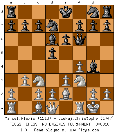 Last move : 1-0 2008 October 8 23:1:7 [Event "FICGS__CHESS__NO_ENGINES_TOURNAMENT__000010"] [Site "FICGS"] [Date "2008.08.29"] [Round "1"] [White "Marcel,Alexis"] [Black "Czekaj,Christophe"] [Result "1-0"] [WhiteElo "1213"] [BlackElo "1747"] 1.f4 d5 2.Nf3 Bg4 3.e3 Nd7 4.Be2 e6 5.O-O Bd6 6.b3 Qf6 7.Nc3 1-0 This chess game has been lost on time (started : 2008.08.29 10:49:23) Bird's Opening Kingside Castling by player White (move 5) Player White won this chess game. Follow this game move after move (download)At this time Fischer is simply a level above all the best Chessplayers in the world. (John Jacobs) Obwohl ich vom Stil her kaum zu den Priestern der Schachkunst gezählt werde, halte ich Schach doch für eine Kunst. (Tigran Petrosjan) Botvinnik trataba de restarle el misterio al Ajedrez, siempre relacionandolo a situaciones de la vida ordinaria. El gustaba de llamar al Ajedrez un típico problema inexacto similar a aquellos de los cuales la gente siempre tiene que enfrentarse en la vida cotidiana. (Garry Kasparov) Le système Elo représente seulement une moyenne. Il est simplement un indicateur de votre stabilité. (Anatoli Karpov) All men can see these tactics whereby I conquer, but what none can see is the strategy out of which victory is evolved. (Sun Tzu)