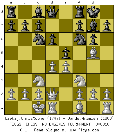 Last move : 0-1 2008 October 11 23:18:20 [Event "FICGS__CHESS__NO_ENGINES_TOURNAMENT__000010"] [Site "FICGS"] [Date "2008.08.29"] [Round "1"] [White "Czekaj,Christophe"] [Black "Dande,Animish"] [Result "0-1"] [WhiteElo "1747"] [BlackElo "1800"] 1.d4 Nf6 2.Nc3 g6 3.e4 d6 4.Bg5 Bg7 5.Qd2 O-O 6.O-O-O Nc6 7.Nf3 e5 0-1 This chess game has been lost on time (started : 2008.08.29 10:49:23) Queen's pawn game Kingside Castling by player Black (move 5) Queenside Castling by player White (move 6) Player Black won this chess game. Follow this game move after move (download)The Chess pieces are the block alphabet which shapes thoughts; and these thoughts, although making a visual design on the chessboard, express their beauty abstractly, like a poem. (Marcel Duchamp) Ich bin es gewohnt, das die Jugend mir überhaupt keinen Respekt entgegenbringt. (Alexander Morozewich) Una compensación adecuada por un sacrificio es tener una combinación sólida que conduce a una posición ganadora; una compensación adecuada por una metida de pata es dejar a tu oponente arrebatar una derrota de las fauces de la victoria. (Bruce A. Moon) Les échecs, c'est l'art d'analyser. (Mikhail Botvinnik) Life is like a ten-speed bicycle: most of us have gears we never use. (Charles M. Schulz)