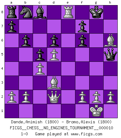 Last move : 1-0 2008 September 14 21:15:28 [Event "FICGS__CHESS__NO_ENGINES_TOURNAMENT__000010"] [Site "FICGS"] [Date "2008.08.29"] [Round "1"] [White "Dande,Animish"] [Black "Bromo,Alexis"] [Result "1-0"] [WhiteElo "1800"] [BlackElo "1800"] 1.e4 c5 2.Nf3 Nc6 3.d4 e6 4.d5 exd5 5.exd5 Qe7+ 6.Be2 Nb8 7.c4 d6 8.O-O h6 9.Nc3 Nf6 10.Re1 Qd7 11.Nd2 Be7 12.Nde4 O-O 13.Nxf6+ Bxf6 14.Ne4 b6 15.Nxf6+ gxf6 16.Bxh6 Re8 17.Qd3 Qf5 18.Rac1 Kh7 19.Qd2 Kg8 20.Bd3 Rxe1+ 21.Rxe1 Qh5 22.Re8+ 1-0 Sicilian defense Kingside Castling by player White (move 8) Kingside Castling by player Black (move 12) Player White won this chess game. Follow this game move after move (download)No one ever won a game by resigning. (Unknown) Ich bin Weltmeister und muß mit niemandem irgend etwas diskutieren. (Viswanathan Anand) Cuando no sepas que mover, espera por una idea que se le venga a la la cabeza de tu oponente. Tenlo por seguro de que esa idea estará incorrecta. (Siegbert Tarrasch) Les sacrifices démontrent seulement que quelqu'un a gaffé. (Savielly Tartacover) They say poker is a zero-sum game. It must be, because every time I play my sum ends up zero. (Max Shapiro)