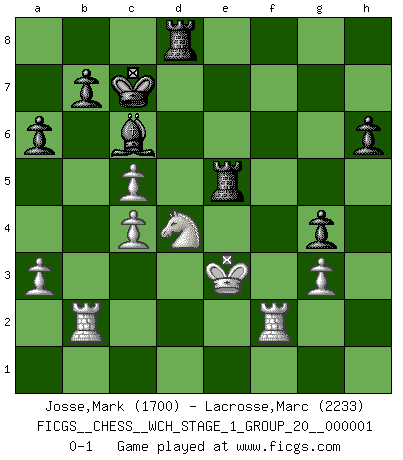 Last move : 0-1 2006 August 27 11:14:33 [Event "FICGS__CHESS__WCH_STAGE_1_GROUP_20__000001"] [Site "FICGS"] [Date "2006.08.04"] [Round "1"] [White "Josse,Mark"] [Black "Lacrosse,Marc"] [Result "0-1"] [WhiteElo "1700"] [BlackElo "2233"] 1.e4 c5 2.Nc3 Nc6 3.f4 g6 4.Nf3 Bg7 5.Bb5 Nd4 6.O-O Nxb5 7.Nxb5 d5 8.exd5 a6 9.Nc3 Nf6 10.d4 Nxd5 11.dxc5 Nxc3 12.Qxd8+ Kxd8 13.bxc3 Be6 14.a3 Kc7 15.Rb1 Bxc3 16.Bb2 Bxb2 17.Rxb2 Bd5 18.Kf2 Rad8 19.Rfb1 Rhe8 20.Ke3 e5 21.fxe5 f6 22.g3 Bc6 23.c4 g5 24.h3 h6 25.Rf1 f5 26.R1f2 g4 27.hxg4 fxg4 28.Nd4 Rxe5+ 0-1 Sicilian : Grand Prix attack Kingside Castling by player White (move 6) Player Black won this chess game. Follow this game move after move (download)It is no time to be playing Chess when the house is on fire. (Italian Proverb) Die Partien sind immer verschieden, die Interviews immer die gleichen. (Garry Kasparov) Cuando tu casa esta en llamas, no puedes ser molestado por tus vecinos. O, como decinos en Ajedrez, si tu Rey esta bajo ataque, no te preocupa perder un Peón del lado de la Reina. (Gary Kasparov) Le génie consiste à savoir transgresser les règles au moment opportun. (Teichmann) Once you start thinking you have nothing left to learn, you have everything to learn. (Steve Badget)