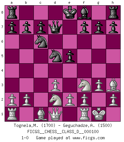 Last move : 1-0 2008 October 18 0:11:6 [Event "FICGS__CHESS__CLASS_D__000100"] [Site "FICGS"] [Date "2008.08.29"] [Round "1"] [White "Tognela,Matteo"] [Black "Geguchadze,Alexander"] [Result "1-0"] [WhiteElo "1700"] [BlackElo "1500"] 1.Nf3 Nf6 2.g3 d5 3.Bg2 Bf5 4.O-O Nc6 5.d3 e5 6.Nbd2 Qd7 7.c4 Bh3 8.cxd5 Nxd5 9.Bxh3 1-0 This chess game has been lost on time (started : 2008.08.29 23:37:18) Reti Opening Kingside Castling by player White (move 4) Player White won this chess game. Follow this game move after move (download)In life, as in Chess, one's own Pawns block one's way. A man's very wealth, ease, leisure, children, books, which should help him to win, more often checkmate him. (Charles Buxton) Der Partner hat auch seine Existenzberechtigung. (Savielly Grigorievitsch Tartakower) El Ajedrez es un mar en el cual un mosquito puede beber y un elefante puede bañarse. (Refrán Hindú) Je menace de comprendre la position. (Anonyme) If everyone is thinking alike, then somebody isn't thinking. (US General George S. Patton)