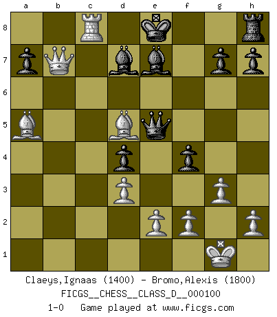 Last move : 1-0 2008 September 23 19:52:53 [Event "FICGS__CHESS__CLASS_D__000100"] [Site "FICGS"] [Date "2008.08.29"] [Round "1"] [White "Claeys,Ignaas"] [Black "Bromo,Alexis"] [Result "1-0"] [WhiteElo "1400"] [BlackElo "1800"] 1.Nf3 d5 2.g3 c5 3.c4 dxc4 4.Bg2 Nc6 5.O-O e5 6.Qa4 Bd7 7.Qxc4 f6 8.Nc3 Nge7 9.Ne4 Nc8 10.d3 Nb6 11.Qc3 Nd5 12.Qb3 Nb6 13.Be3 Nd4 14.Nxd4 cxd4 15.Bd2 Nc8 16.Qxb7 Rb8 17.Qa6 Rxb2 18.Rac1 f5 19.Ba5 Rxa2 20.Ra1 Rxa1 21.Rxa1 Qe7 22.Nd2 Qd6 23.Qb7 Be7 24.Nc4 Qe6 25.Bd5 Qf6 26.Rc1 f4 27.Nxe5 Qxe5 28.Rxc8+ 1-0 Reti : King's Indian attack (with ...c5) Kingside Castling by player White (move 5) Player White won this chess game. Follow this game move after move (download)When you see a good move, look for a better one. (Emanuel Lasker) Versuche, dich von der Sklaverei der Eröffnungsvarianten zu befreien. Stattdessen soll man gewisse Typenpositionen erlernen, die man eingehend analysiert. (Aaron Nimzowitsch) El jugador táctico sabe que hacer cuando hay algo que hacer; mientras que el estratega sabe que hacer cuando no hay nada que hacer. (Gerald Abrahams) Avant la finale, les dieux ont créé le milieu de partie. (Tarrasch) Heh, heh, heh. Time to abandon ship. (General Grievous in Star Wars ep.3)