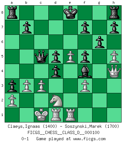 Last move : 0-1 2008 September 10 16:35:30 [Event "FICGS__CHESS__CLASS_D__000100"] [Site "FICGS"] [Date "2008.08.29"] [Round "1"] [White "Claeys,Ignaas"] [Black "Soszynski,Marek"] [Result "0-1"] [WhiteElo "1400"] [BlackElo "1700"] 1.Nf3 d5 2.g3 Bg4 3.Ne5 Bf5 4.d3 Nd7 5.Bf4 Ngf6 6.Bg2 Nh5 7.Nxd7 Nxf4 8.gxf4 Qxd7 9.Nd2 g6 10.e4 Bg4 11.f3 Be6 12.Qe2 Qd6 13.e5 Qb4 14.O-O-O Bh6 15.c3 Qb6 16.d4 Bf5 17.Rhe1 e6 18.Qf1 Bxf4 19.Bh3 a5 20.Bxf5 exf5 21.h4 a4 22.Qh3 c5 23.h5 a3 24.b3 cxd4 25.Qh4 Qc5 0-1 Reti : King's Indian attack (Barcza system) Queenside Castling by player White (move 14) Player Black won this chess game. Follow this game move after move (download)The enormous mental resilience, without which no Chess player can exist, was so much taken up by Chess that he could never free his mind of this game. (Albert Einstein) Ein Gewinn durch eine ungenaue Kombination, sei sie auch noch so vorzeigbar, erfüllt mich mit Schaudern. (Wilhelm Steinitz) El jugador blanco perdió porque fallo en recordar la coreccta continuación y tuvo que pensar por sí mismo las movidas. (Siegbert Tarrasch) Celui qui prend des risques peut perdre, celui qui n'en prend pas perd toujours. (Xavier Tartacover) Sometimes it pays to stay in bed in Monday, rather than spending the rest of the week debugging Monday's code. (Dan Salomon)