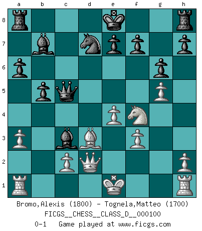 Last move : 0-1 2008 August 31 15:49:24 [Event "FICGS__CHESS__CLASS_D__000100"] [Site "FICGS"] [Date "2008.08.29"] [Round "1"] [White "Bromo,Alexis"] [Black "Tognela,Matteo"] [Result "0-1"] [WhiteElo "1800"] [BlackElo "1700"] 1.e4 d6 2.d4 Nf6 3.f3 g6 4.Nc3 c6 5.Be3 b5 6.a3 Nbd7 7.Qd2 Bb7 8.Bd3 a6 9.Nge2 Qc7 10.b4 c5 11.bxc5 dxc5 12.dxc5 Nxc5 13.Bxc5 Qxc5 14.g4 Bg7 15.g5 Nd7 16.Nf4 Bxc3 0-1 King's pawn Opening Player Black won this chess game. Follow this game move after move (download)I'm not a materialistic person, in that, I don't suffer the lack or loss of money. The absence of worldly goods I don't look back on. For Chess is a way I can be as materialistic as I want without having to sell my soul. (Jamie Walter Adams) Es hat in meinem Leben Zeiten gegeben, da ich sehr nahe daran war zu glauben, daß ich auch nicht eine einzige Schachpartie verlieren könnte. (José Raúl Capablanca) Los libros de Ajedrez deben de usarse igual como usamos los anteojos: para mejorar la vista, aunque algunos jugadores los quieren usar como si ellos les otorgaran la vision. (José Raúl Capablanca) Ce qui est bien, c'est d'avoir tout un tas de pièces en prise : l'adversaire ne peut en prendre qu'une à la fois. Cité par Thierry Audin. If only faces could talk... (Pat Summerall, Sportscaster during the Super Bowl)