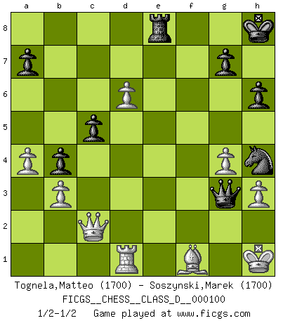Last move : 1/2-1/2 2008 September 3 20:15:12 [Event "FICGS__CHESS__CLASS_D__000100"] [Site "FICGS"] [Date "2008.08.29"] [Round "1"] [White "Tognela,Matteo"] [Black "Soszynski,Marek"] [Result "1/2-1/2"] [WhiteElo "1700"] [BlackElo "1700"] 1.Nf3 d5 2.g3 Bg4 3.Bg2 Nd7 4.c4 e6 5.cxd5 exd5 6.O-O c6 7.d3 Bd6 8.Nc3 Ne7 9.Qa4 Bxf3 10.Bxf3 O-O 11.e4 Ne5 12.Bg2 b5 13.Qc2 dxe4 14.Bxe4 h6 15.d4 Nc4 16.a4 b4 17.Nd1 Na5 18.Ne3 Rc8 19.b3 c5 20.d5 Be5 21.Bb2 Bxb2 22.Qxb2 f5 23.Bd3 f4 24.Nc4 Nxc4 25.Bxc4 Nf5 26.Rfe1 Kh8 27.Rad1 Rf6 28.Qc1 Nd4 29.Re4 fxg3 30.fxg3 Rf3 31.Re3 Qg5 32.Rxf3 Nxf3+ 33.Kg2 Qg4 34.Qc2 Qh5 35.h3 Re8 36.g4 Nh4+ 37.Kh1 Qe5 38.d6 Qg3 39.Bf1 Qf3+ 40.Kg1 Qg3+ 41.Kh1 Qf3+ 42.Kg1 Qg3+ 43.Kh1 1/2-1/2 Reti : King's Indian attack, Keres variation Kingside Castling by player White (move 6) Kingside Castling by player Black (move 10) This chess game ended in a draw. Follow this game move after move (download)We cannot resist the fascination of sacrifice, since a passion for sacrifices is part of a Chessplayer's nature. (Rudolf Spielman) Viele Opfer benötigen überhaupt keine konkrete Berechnung. Es genügt sich die entstehende Position kurz vorzustellen, um uns davon zu überzeugen, dass das Opfer korrekt ist. (Mikhail Nekhemyevich Tal) El Ajedrez es un mar en el cual un mosquito puede beber y un elefante puede bañarse. (Refrán Hindú) Toute estimation doit être constamment réévaluée. (Jacob Estrin) Without enthusiasm, virtue functions not at all, and vice only poorly. (Mignon McLaughlin, The Neurotic's Notebook, 1960)