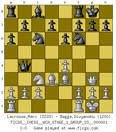 Last move : 1-0 2006 October 9 17:47:35 [Event "FICGS__CHESS__WCH_STAGE_1_GROUP_20__000001"] [Site "FICGS"] [Date "2006.08.04"] [Round "1"] [White "Lacrosse,Marc"] [Black "Bagga,Divyanshu"] [Result "1-0"] [WhiteElo "2233"] [BlackElo "1200"] 1.e4 c5 2.Nc3 Nc6 3.Nf3 e6 4.d4 cxd4 5.Nxd4 Qb6 6.Ndb5 a6 7.Nd6+ Bxd6 8.Qxd6 Nf6 9.Bd3 Qd4 10.Qg3 O-O 11.Be3 Qb4 12.O-O 1-0 This chess game has been lost on time (started : 2006.08.04 14:29:32) Sicilian : Closed, 2...Nc6 Kingside Castling by player Black (move 10) Kingside Castling by player White (move 12) Player White won this chess game. Follow this game move after move (download)The older I grow, the more I value pawns. (Paul Keres) Die starken Figuren des Gegners muss man abtauschen. (José Raúl Capablanca) El Ajedrez, como la música, como el amor, tiene el poder de hacer feliz a la gente. (Siegbert Tarrasch) Si rien de grave n'est détecté lors de l'analyse d'une position, on joue alors le coup. Seconde règle de Blumenfeld. We cannot be sure of having something to live for unless we are willing to die for it. (Ernesto Che Guevara)