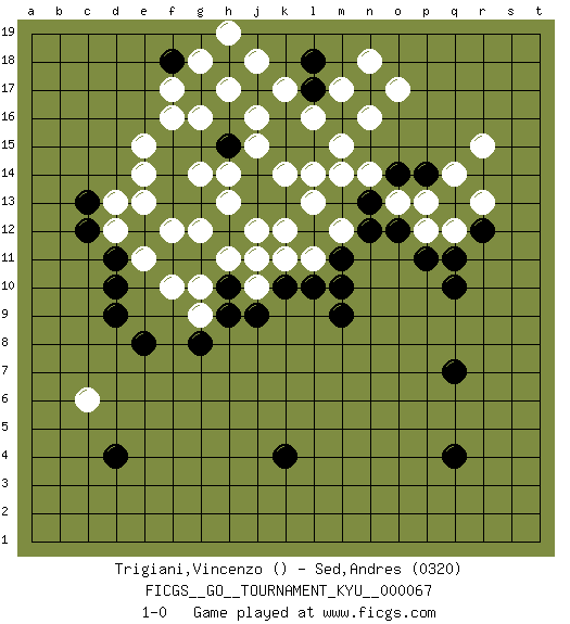 Last move : 1-0 2009 January 18 7:15:51 [Event "FICGS__GO__TOURNAMENT_KYU__000067"] [Site "FICGS"] [Date "2008.08.30"] [Round "1"] [Black "Trigiani,Vincenzo"] [White "Sed,Andres"] [Result "1-0"] [Rating 2 "0320"] 1.d4 l11 2.k4 f16 3.q10 p13 4.q4 f10 5.q7 r15 6.k10 k11 7.l10 j10 8.j9 j11 9.m10 c6 10.h9 g9 11.h10 h11 12.m11 m12 13.l12 l13 14.g11 k12 15.h12 g10 16.f11 e11 17.g13 f12 18.e12 g12 19.n12 h13 20.f13 j12 21.d11 e13 22.d10 d12 23.d9 g14 24.f14 e14 25.f15 e15 26.g15 h14 27.h15 j15 28.h16 g16 29.g17 j16 30.k15 h17 31.h18 j18 32.j17 k17 33.h15 g18 34.f18 h19 35.k16 f17 36.o12 l16 37.l15 m14 38.l17 m15 39.m16 k14 40.p11 l14 41.n13 l16 42.g8 m17 43.n17 n16 44.l18 n18 45.e8 o17 46.q13 q12 47.o14 q14 48.c12 d13 49.c13 o13 50.p14 p12 51.q11 r13 52.m9 n14 53.r12 1-0 This go game has been lost on time (started : 2008.08.30 2:46:16) Here are the names of the openings (joseki) played in the four corners : Player Black won this Go (weiqi, baduk) game. Follow this game move after move (download)Don't disturb symmetry. (Anonymous) Even the best needles are not sharp at both ends. (Chinese proverb)