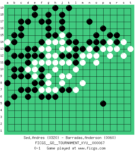Last move : 0-1 2009 February 13 21:7:35 [Event "FICGS__GO__TOURNAMENT_KYU__000067"] [Site "FICGS"] [Date "2008.08.30"] [Round "1"] [Black "Sed,Andres"] [White "Barradas,Anderson"] [Result "0-1"] [Rating 1 "0320"] [Rating 2 "0060"] 1.e16 d16 2.k10 e14 3.j16 d15 4.g17 f13 5.f9 e11 6.d6 h14 7.l13 j15 8.k15 j14 9.k14 j13 10.p5 q12 11.j12 h12 12.h15 h16 13.g15 g14 14.g16 h17 15.j17 h18 16.j18 j19 17.k19 g19 18.g18 f18 19.h19 f19 20.f17 k13 21.k12 h11 22.e18 f15 23.d17 f16 24.e19 e15 25.c16 e17 26.c17 e16 27.c15 c14 28.b14 c13 29.j7 j11 30.l12 o11 31.j10 h10 32.n17 k11 33.l11 j9 34.c12 l10 35.d13 d14 36.d12 k9 37.e13 b13 38.b15 a14 39.b12 a12 40.a11 b11 41.a13 c11 42.f14 g12 43.d11 d10 44.d9 e10 45.f12 g13 46.b9 m11 47.l14 m12 48.m13 n13 49.c10 e9 50.b10 m8 51.e12 f11 52.n14 o14 53.e8 g9 54.f8 g8 55.f10 d8 56.c9 g11 57.d7 c8 58.e7 b8 59.c7 b7 60.b6 a6 61.a8 a7 62.a5 f7 63.f6 g7 64.o15 p15 65.o13 n12 66.p14 q14 67.q13 r13 68.q15 p13 69.p16 o12 70.r14 q13 71.s13 s12 72.o14 s14 73.r15 t13 74.g6 h7 75.h6 j8 76.k7 l7 0-1 This go game has been lost on time (started : 2008.08.30 2:46:16) Here are the names of the openings (joseki) played in the four corners : Corner d16 : e16 d16 Takamoku (Gomok, Gaomu`) 5-4 Point. The takamoku (high) point (5-4). With its emphasis on influence, the 5-4 point complements the 4-4 (hoshi) point in creating an influence-oriented fuseki. Corner q16 : l13 q12 This joseki is unknown. A weak or weird move has probably been played in this corner. Corner q4 : p5 m8 Go-no-go (Wu~wu~) 5-5 Point. The 5-5 was experimented with briefly during the "New Fuseki" movement in Japan in the 1930s. The 5-5 point has not retained popularity because the 4-4 hoshi (star) point strikes a better balance between influence and territory. As one can see from the variations, though, the 5-5 is playable. Player White won this Go (weiqi, baduk) game. Follow this game move after move (download)Proverbs do not apply to White. (Tero Sand) Strategy without tactics is the slowest route to victory. Tactics without strategy is the noise before defeat. (Sun Tzu)