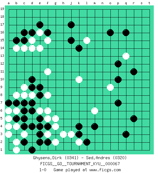 Last move : 1-0 2009 January 5 17:30:53 [Event "FICGS__GO__TOURNAMENT_KYU__000067"] [Site "FICGS"] [Date "2008.08.30"] [Round "1"] [Black "Ghysens,Dirk"] [White "Sed,Andres"] [Result "1-0"] [Rating 1 "0341"] [Rating 2 "0320"] 1.q16 k10 2.q3 o9 3.d16 e4 4.m4 f11 5.r5 l15 6.c4 h3 7.e3 d3 8.d4 f3 9.e2 d2 10.f2 g2 11.f4 g4 12.e5 f5 13.e4 g5 14.k3 c3 15.b3 j3 16.k4 k2 17.l2 e6 18.f16 d5 19.d6 c5 20.d7 f6 21.j17 b4 22.c2 q13 23.o16 b2 24.d1 a3 25.b5 c3 26.c6 a5 27.r11 b6 28.c5 b1 29.b7 a6 30.p12 c9 31.p10 m6 32.p7 c14 33.c15 d15 34.b15 e14 35.e9 e16 36.e17 b14 37.d9 b8 38.a7 a4 39.k14 f15 40.e15 d14 41.j15 e16 42.c16 f8 43.d10 d8 44.e8 c8 45.c7 1-0 This go game has been lost on time (started : 2008.08.30 2:46:16) Here are the names of the openings (joseki) played in the four corners : Corner q4 : q3 o9 Komoku (Somok, Xiao~mu`) 3-4 Point. The komoku (3-4) point is the traditional corner enclosure move.. Corner d16 : d16 f11 Hoshi (Hwajeom, Seongjeom, Xingwei`) 4-4 Point. The star or hoshi (4-4) point, emphasizing influence at the potential expense of territory. Corner q16 : q16 l15 Hoshi (Hwajeom, Seongjeom, Xingwei`) 4-4 Point. The star or hoshi (4-4) point, emphasizing influence at the potential expense of territory. Corner d4 : e4 c4 Takamoku (Gomok, Gaomu`) 5-4 Point. The takamoku (high) point (5-4). With its emphasis on influence, the 5-4 point complements the 4-4 (hoshi) point in creating an influence-oriented fuseki. Komoku. White responds with 3-3, 3-5, 4-6, 4-7, 3-6, 3-7. Player Black won this Go (weiqi, baduk) game. Follow this game move after move (download)Pon-nuki is worth thirty points. (Anonymous) In God we trust, all others we virus scan. (Anonymous)