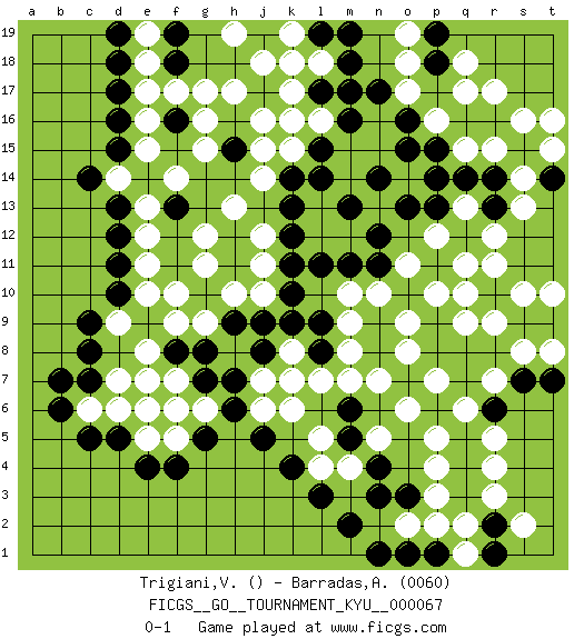 Last move : 0-1 2009 March 9 22:28:31 [Event "FICGS__GO__TOURNAMENT_KYU__000067"] [Site "FICGS"] [Date "2008.08.30"] [Round "1"] [Black "Trigiani,Vincenzo"] [White "Barradas,Anderson"] [Result "0-1"] [Rating 2 "0060"] 1.k10 j11 2.k11 j10 3.j9 h10 4.h9 g9 5.k9 j12 6.h11 g11 7.h12 h13 8.k12 g12 9.k13 j14 10.k14 k15 11.l15 j15 12.k16 j16 13.j17 k17 14.l17 l16 15.m16 k16 16.g10 f10 17.g8 f9 18.k18 l18 19.m17 j18 20.m18 k19 21.g7 h17 22.h6 m15 23.l14 m14 24.m13 n15 25.n14 n16 26.n17 o17 27.o16 o18 28.o15 o19 29.m19 p16 30.l19 k18 31.p15 q17 32.q16 r17 33.r16 s16 34.s15 t15 35.t14 t16 36.j19 h19 37.f8 s14 38.r14 r15 39.p14 q15 40.q14 s13 41.e9 e10 42.d10 e11 43.d11 e12 44.d12 e13 45.f13 f14 46.d13 d14 47.d15 e15 48.d16 e16 49.d17 e17 50.d18 e18 51.f18 e19 52.d19 f17 53.r13 r12 54.q12 q11 55.p11 p10 56.o10 o9 57.p9 q10 58.r10 q9 59.f19 g17 60.f16 g16 61.p8 o8 62.q8 r9 63.s9 s10 64.r8 r11 65.o7 o11 66.n11 p12 67.p13 s8 68.t9 t8 69.s7 t10 70.o13 n10 71.n12 q13 72.l11 n7 73.p18 m10 74.l9 m9 75.m11 m8 76.l8 l7 77.m6 o6 78.p6 p7 79.r6 q6 80.q5 p5 81.j8 k6 82.j5 l5 83.k4 l4 84.l3 p4 85.q4 p3 86.q3 q2 87.m2 e8 88.k7 j7 89.h7 j6 90.m5 m4 91.h15 g15 92.p19 q18 93.n3 o2 94.n1 d9 95.p1 q1 96.q7 r7 97.t7 r3 98.r2 r4 99.e7 d7 100.c8 e6 101.f6 f7 102.g5 e7 103.c7 c6 104.c5 d6 105.d5 e5 106.e4 f5 107.f4 g6 108.c9 f6 109.b6 k8 110.b7 k7 111.c14 n5 112.n4 m7 113.o3 r5 114.o1 p2 115.r1 s2 0-1 Here are the names of the openings (joseki) played in the four corners : Corner q4 : o9 p9 This joseki is unknown. A weak or weird move has probably been played in this corner. Player White won this Go (weiqi, baduk) game. Follow this game move after move (download)If your stone is capped, play the knight's move. (Anonymous) Games, world of games... There's always an opponent, and there's always a victim. (Revolver, movie)