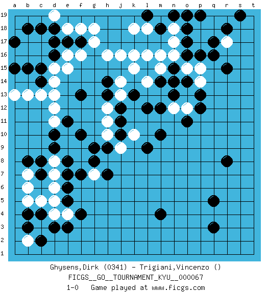 Last move : 1-0 2009 February 19 21:27:49 [Event "FICGS__GO__TOURNAMENT_KYU__000067"] [Site "FICGS"] [Date "2008.08.30"] [Round "1"] [Black "Ghysens,Dirk"] [White "Trigiani,Vincenzo"] [Result "1-0"] [Rating 1 "0341"] 1.q16 k16 2.e17 k15 3.d3 e16 4.f17 f16 5.d17 g17 6.d16 g18 7.q3 f18 8.m4 d4 9.e3 e4 10.f4 k10 11.c4 e18 12.d18 d19 13.c14 e15 14.q5 d15 15.c15 c16 16.c18 d14 17.b15 d13 18.e5 c17 19.b18 b17 20.p12 c13 21.o16 b13 22.d9 d5 23.e6 d6 24.e7 d7 25.c8 d8 26.e8 e9 27.d10 e10 28.e11 d11 29.f10 f9 30.g9 f8 31.g8 g7 32.f7 c5 33.b4 c3 34.h7 b5 35.b3 b2 36.c2 b6 37.c7 b7 38.b8 d12 39.m10 b16 40.a17 a16 41.a15 a13 42.l9 l16 43.r8 m16 44.r15 n16 45.o17 n17 46.n15 n14 47.o14 p15 48.n13 p17 49.p16 o15 50.m14 p14 51.p13 o12 52.o11 m15 53.n14 l14 54.o18 p18 55.q17 q18 56.p19 q19 57.o19 n18 58.n19 m19 59.m18 l18 60.l19 r17 61.r18 r19 62.s19 n12 63.m12 k18 64.j11 j16 65.f13 h16 66.h13 h12 67.j12 j13 68.h14 h11 69.j10 h10 70.h9 j9 71.k13 j14 72.l12 1-0 This go game has been lost on time (started : 2008.08.30 2:46:16) Here are the names of the openings (joseki) played in the four corners : Corner d16 : e17 e16 Mokuhazushi (Waemok, Wai`mu`) 5-3 Point. The mokuhazushi (5-3) point was popular in the Edo period in Japan (1600 - 1867). It emphasizes influence; territorially, it is inferior to the 3-4 point. Corner d4 : d3 d4 Komoku (Somok, Xiao~mu`) 3-4 Point. The komoku (3-4) point is the traditional corner enclosure move.. Player Black won this Go (weiqi, baduk) game. Follow this game move after move (download)Sacrifice for shape. (Anonymous) When I took office, only high energy physicists had ever heard of what is called the World Wide Web... Now even my cat has its own page. (Bill Clinton, 1996)