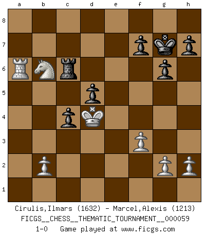 Last move : 1-0 2008 September 24 17:4:19 [Event "FICGS__CHESS__THEMATIC_TOURNAMENT__000059"] [Site "FICGS"] [Date "2008.09.02"] [Round "1"] [White "Cirulis,Ilmars"] [Black "Marcel,Alexis"] [Result "1-0"] [WhiteElo "1632"] [BlackElo "1213"] 1.d4 Nf6 2.c4 c5 3.d5 b5 4.cxb5 Qa5+ 5.Nc3 d6 6.e3 a6 7.Bd2 axb5 8.Bxb5+ Bd7 9.a4 Bxb5 10.Nxb5 Qd8 11.Qb3 Nbd7 12.Nf3 g6 13.a5 Bg7 14.a6 O-O 15.a7 Nb6 16.O-O Nc8 17.Ra6 Qd7 18.Rfa1 Ne8 19.Bc3 Nc7 20.Nxc7 Qxc7 21.Bxg7 Kxg7 22.Qa4 Nb6 23.Qc6 Qxc6 24.dxc6 Nd5 25.Nd2 Rfc8 26.Nc4 Rc7 27.e4 Nb4 28.Nb6 Nxa6 29.Nxa8 Rxa7 30.Nb6 Rc7 31.Rxa6 Rxc6 32.f3 e6 33.Kf2 c4 34.Ke3 d5 35.exd5 exd5 36.Kd4 1-0 Benko gambit Kingside Castling by player Black (move 14) Kingside Castling by player White (move 16) Player White won this chess game. Follow this game move after move (download)Before the endgame, the Gods have placed the middle game. (Siegbert Tarrasch) Die jungen Leute sollen verstehen, dass sie noch etwas von mir lernen können und müssen. (Viktor Kortschnoi) Morphy probablemente fue el genio más grande de todos. (Bobby Fischer) Vous n'êtes pas toujours obligé de jouer le meilleur coup. Un coup doit être actif, entreprenant, correct et beau ! (David Bronstein) Plans are ideas that never come to fruition. (Daniel Parmet)