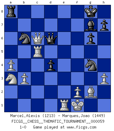 Last move : 1-0 2008 October 9 13:2:30 [Event "FICGS__CHESS__THEMATIC_TOURNAMENT__000059"] [Site "FICGS"] [Date "2008.09.02"] [Round "1"] [White "Marcel,Alexis"] [Black "Marques,Joao"] [Result "1-0"] [WhiteElo "1213"] [BlackElo "1449"] 1.d4 Nf6 2.c4 c5 3.d5 b5 4.cxb5 a6 5.bxa6 Bxa6 6.Nc3 g6 7.g3 d6 8.Bg2 Bg7 9.Nf3 O-O 10.O-O Nbd7 11.a3 Nb6 12.Re1 Bb7 13.e4 e6 14.dxe6 fxe6 15.b3 Qc7 16.a4 Nfd7 17.Nb5 Qb8 18.Rb1 d5 19.exd5 exd5 20.Bf4 Rxf4 21.gxf4 Qxf4 22.Rc1 d4 23.Na3 Nf6 24.Rxc5 Ng4 25.h3 Bxf3 26.Qxf3 Qh2+ 27.Kf1 Qd6 28.Qc6 1-0 Benko gambit accepted Kingside Castling by player Black (move 9) Kingside Castling by player White (move 10) Player White won this chess game. Follow this game move after move (download)Chess is a fairy tale of 1001 blunders. (Savielly Tartakower) Schach ist wie eine schöne Frau, zu der wir ständig zurückkehren, gleichviel, wie oft sie uns zurückweist. (Anonymous) Es muy difícil jugar en contra de la teoría de Einstein. - en su primera derrota en contra de Fischer (Mikhail Tal) Mais n'est-ce pas déjà le limiter injurieusement que d'appeler les échecs un jeu? N'est-ce pas aussi une science, un art, ou quelque chose qui, comme le cercueil de Mahomet entre ciel et terre, est suspendu entre l'un et l'autre, et qui réunit un nombre incroyable de contraires ? (Stefan Zweig) Computers are like Old Testament gods; lots of rules and no mercy. (Joseph Campbell)