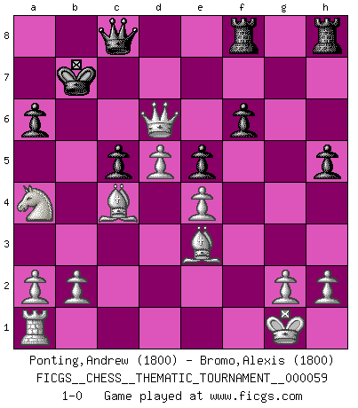 Last move : 1-0 2008 September 13 20:39:45 [Event "FICGS__CHESS__THEMATIC_TOURNAMENT__000059"] [Site "FICGS"] [Date "2008.09.02"] [Round "1"] [White "Ponting,Andrew"] [Black "Bromo,Alexis"] [Result "1-0"] [WhiteElo "1800"] [BlackElo "1800"] 1.d4 Nf6 2.c4 c5 3.d5 b5 4.f3 bxc4 5.e4 e5 6.Bxc4 d6 7.Nc3 a6 8.f4 Nbd7 9.Nf3 h6 10.fxe5 Nxe5 11.Nxe5 dxe5 12.O-O Bd6 13.Qf3 Bg4 14.Qg3 Qb6 15.Rxf6 gxf6 16.Qxg4 h5 17.Qg7 O-O-O 18.Qxf7 Rdf8 19.Qe6+ Kb7 20.Na4 Qc7 21.Be3 Qc8 22.Qxd6 1-0 Benko gambit Kingside Castling by player White (move 12) Queenside Castling by player Black (move 17) Player White won this chess game. Follow this game move after move (download)Everything is in a state of flux, and this includes the world of Chess. (Mikhail Botvinnik) Auf jeden Fall musst du zuerst Rechtsanwalt werden, damit du deine eigenen Interessen und die deiner Familie vertreten kannst. [Brief an seinen Sohn] (José Raúl Capablanca) Si el ingenio solamente fuese necesario para lucirse, las mujeres serían las mejores jugadoras de Ajedrez del mundo. (Albin) Le profane ne songe pas à la somme de jouissance dont il se prive, qui méconnaît ce jeu aux ressources aussi variées que passionnantes. (Jean-Marie Jeanton-Lamarche) I just play for fun. (Anna Kournikova)