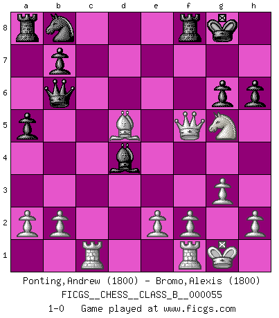 Last move : 1-0 2008 September 13 20:15:13 [Event "FICGS__CHESS__CLASS_B__000055"] [Site "FICGS"] [Date "2008.09.02"] [Round "1"] [White "Ponting,Andrew"] [Black "Bromo,Alexis"] [Result "1-0"] [WhiteElo "1800"] [BlackElo "1800"] 1.d4 d5 2.c4 e6 3.Nf3 Nf6 4.Nc3 c5 5.cxd5 exd5 6.g3 Be6 7.Bg2 Be7 8.O-O O-O 9.dxc5 Bxc5 10.Bg5 h6 11.Bxf6 Qxf6 12.Nxd5 Bxd5 13.Qxd5 Qb6 14.Ne5 a5 15.Rac1 Bd4 16.Nxf7 Kh7 17.Qf5+ g6 18.Ng5+ Kg8 19.Bd5+ 1-0 Queen's gambit declined Kingside Castling by player White (move 8) Kingside Castling by player Black (move 8) Player White won this chess game. Follow this game move after move (download)The passion for playing Chess is one of the most unaccountable in the world. (H.G. Wells) Ja, jede Frau in Holland liebt mich bestimmt, und alle Männer hassen mich. (Loek van Wely) Después de una mala apertura, hay una esperanza en el juego medio. Pero una vez que estas en finales, el momento de la verdad ha llegado. (Edmar Mednis) On peut tirer plus d'utilité d'une partie perdue que de 100 parties gagnées. (Capablanca) Computers make it easier to do a lot of things, but most of the things they make it easier to do don't need to be done. (Andy Rooney)