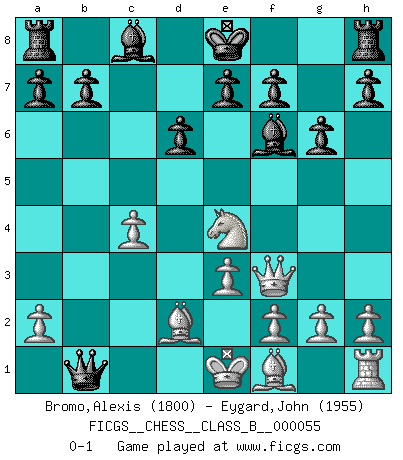 Last move : 0-1 2008 September 18 6:53:48 [Event "FICGS__CHESS__CLASS_B__000055"] [Site "FICGS"] [Date "2008.09.02"] [Round "1"] [White "Bromo,Alexis"] [Black "Eygard,John"] [Result "0-1"] [WhiteElo "1800"] [BlackElo "1955"] 1.c4 Nf6 2.d4 g6 3.Nf3 Bg7 4.Nc3 c5 5.dxc5 Na6 6.e3 Nxc5 7.b4 Nfe4 8.Nxe4 Nxe4 9.Qc2 Bxa1 10.Qxe4 d6 11.Ng5 Qb6 12.Qf3 Bf6 13.Ne4 Qxb4+ 14.Bd2 Qb1+ 0-1 English, 1...Nf6 (Anglo-Indian defense) Player Black won this chess game. Follow this game move after move (download)You cannot play at Chess if you are kind-hearted. (French Proverb) Ich liebe den Moment, wenn ich das Ego meines Gegenüber breche. (Robert James Fischer) El Ajedrez es de 30 a 40 por ciento psicología. Uno no cuenta con esto cuando se juega contra una computadora. No lo puedo confundir. (Judith Polgar) Que feriez-vous si vous étiez en train de jouer aux échecs et que la fin du monde arrive ? Je continuerais à jouer. (Saint Borromée) Do not put your faith in what statistics say until you have carefully considered what they do not say. (William W. Watt)