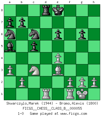 Last move : 1-0 2008 September 3 15:59:58 [Event "FICGS__CHESS__CLASS_B__000055"] [Site "FICGS"] [Date "2008.09.02"] [Round "1"] [White "Skwarczylo,Marek"] [Black "Bromo,Alexis"] [Result "1-0"] [WhiteElo "1944"] [BlackElo "1800"] 1.d4 d5 2.Nf3 c5 3.c4 Nf6 4.cxd5 Nxd5 5.e4 Nb4 6.a3 N4a6 7.d5 e6 8.Nc3 Be7 9.Bb5+ Bd7 10.dxe6 fxe6 11.Ne5 Bxb5 12.Qh5+ g6 13.Nxg6 hxg6 14.Qxh8+ Kd7 15.Qxd8+ Bxd8 16.Nxb5 Ba5+ 17.Nc3 Nc6 18.Be3 Ke8 19.O-O Rd8 20.Rad1 1-0 Queen's pawn game, Krause variation Kingside Castling by player White (move 19) Player White won this chess game. Follow this game move after move (download)Kasparov : J'adoube , Ivanchuk : S'il vous plaît ! (Garry Kasparov & Vassily Ivanchuk, Linares 1997) Wie ich sie so einen nach dem anderen nieder mähte wurde meine Überlegenheit offensichtlich. (José Raúl Capablanca) Me dio la sensación de como si yo estuviera jugando en contra del mismo Ajedrez. - al estar jugando en contra de Robert Fischer (Walter Shipman) Aux échecs, les retours au sommet sont rares : les dommages psychologiques consécutifs à une défaite sont trop sévères. (Daily Telegraph) As the days dwindle down... to a precious few. (Maxwell Anderson)