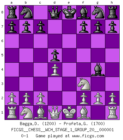 Last move : 0-1 2006 October 5 4:56:22 [Event "FICGS__CHESS__WCH_STAGE_1_GROUP_20__000001"] [Site "FICGS"] [Date "2006.08.04"] [Round "1"] [White "Bagga,Divyanshu"] [Black "Profeta,Giuliano"] [Result "0-1"] [WhiteElo "1200"] [BlackElo "1700"] 1.e4 e6 2.d4 d5 3.exd5 exd5 4.Nf3 Bg4 0-1 This chess game has been lost on time (started : 2006.08.04 14:29:32) French : Exchange variation Player Black won this chess game. Follow this game move after move (download)For surely of all the drugs in the world, Chess must be the most permanently pleasurable. (Assiac) Schon mancher Spieler hat aufgegeben, um zu vermeiden, daß er eine Figur verliert. (Savielly Grigorievitsch Tartakower) Todos los jugadores de Ajedrez deberían tener un pasatiempo. (Savielly Tartakower) Les Echecs mettent en conflit, non pas deux intelligences, mais deux volontés. (Lasker) If we knew what we were doing, we would not call it research. (Albert Einstein)