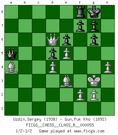 Last move : 1/2-1/2 2009 July 11 0:35:23 [Event "FICGS__CHESS__CLASS_B__000055"] [Site "FICGS"] [Date "2008.09.02"] [Round "1"] [White "Uzdin,Sergey"] [Black "Gun,Puk Kho"] [Result "1/2-1/2"] [WhiteElo "1938"] [BlackElo "1892"] 1.e4 c6 2.d4 d5 3.e5 Bf5 4.Nf3 e6 5.Be2 Ne7 6.O-O Nd7 7.Nh4 Bg6 8.Nd2 Nf5 9.Nxg6 hxg6 10.Nf3 Be7 11.c3 c5 12.a4 Rc8 13.a5 Kf8 14.h3 a6 15.b4 cxb4 16.cxb4 Nh4 17.Nxh4 Rxh4 18.b5 axb5 19.Bxb5 Nb8 20.Be3 Na6 21.Qb3 Nb4 22.Rfc1 Rb8 23.Qa4 Kg8 24.Rab1 Ra8 25.Rxb4 Rxa5 26.Qb3 Bxb4 27.Qxb4 Rh8 28.Bf1 Ra7 29.Qd6 Qa8 30.Rc7 b5 31.Bxb5 Kh7 32.Kh2 Rxc7 33.Qxc7 Rf8 34.Kg3 Kg8 35.h4 Qa2 36.Kh2 Qb1 37.Be2 Qb2 38.Bg4 Qa3 39.Qd6 Qa7 40.Be2 Qb7 41.Ba6 Qb1 42.Kg3 Qd1 43.Qe7 Rb8 44.Bb5 Qb1 45.Be8 Qf5 46.Ba4 Qd3 47.Qd6 Rf8 48.Bd7 Qb3 49.Bc6 Qb6 50.Ba4 Qa5 1/2-1/2 Caro-Kann : Advance variation Kingside Castling by player White (move 6) This chess game ended in a draw. Follow this game move after move (download)Chess is a fighting game which is purely intellectual and includes chance. (Richard Reti) Lisa Lane, amerikanische Schachmeisterin, hatte Fischer einmal als stärksten lebenden Spieler bezeichnet. Antwort: Das ist richtig, aber Lisa Lane ist eigentlich nicht in der Lage, das zu beurteilen. (Robert James Fischer) Las ideas audaces son como las piezas del Ajedrez que avanzan hacia adelante. Ellas pueden ser vencidas, pero también pueden iniciar una partida victoriosa. (Goethe) L'ordinateur a tué l'originalité. Il n'y a plus guère d'aventures sur l'échiquier. (Jacob Murray) You have to believe in yourself. (Sun Tzu)