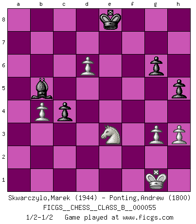 Last move : 1/2-1/2 2008 October 19 12:20:38 [Event "FICGS__CHESS__CLASS_B__000055"] [Site "FICGS"] [Date "2008.09.02"] [Round "1"] [White "Skwarczylo,Marek"] [Black "Ponting,Andrew"] [Result "1/2-1/2"] [WhiteElo "1944"] [BlackElo "1800"] 1.d4 Nf6 2.Nf3 d5 3.c4 c6 4.e3 e6 5.Nc3 Nbd7 6.Qc2 Bd6 7.Bd3 O-O 8.O-O dxc4 9.Bxc4 b5 10.Be2 Bb7 11.Rd1 Qc7 12.e4 e5 13.dxe5 Nxe5 14.Nd4 Bc5 15.h3 Rad8 16.Be3 Qb6 17.Nf5 Bxe3 18.Nxe3 g6 19.Rac1 Kg7 20.b3 a6 21.Qb2 Rfe8 22.Bf1 Re7 23.Rxd8 Qxd8 24.Rd1 Qb6 25.a3 Rd7 26.b4 Rxd1 27.Ncxd1 Qc7 28.f4 Ned7 29.g3 Kg8 30.e5 Ne4 31.Kh2 c5 32.Bg2 c4 33.Qd4 Nf8 34.Qa7 Ne6 35.Kg1 h5 36.f5 Bc6 37.Qxa6 Nd4 38.Bxe4 Bxe4 39.Qd6 Qxd6 40.exd6 Kf8 41.fxg6 fxg6 42.Nc3 Bc6 43.a4 Ke8 44.axb5 Nxb5 45.Nxb5 Bxb5 1/2-1/2 Queen's pawn game Kingside Castling by player Black (move 7) Kingside Castling by player White (move 8) This chess game ended in a draw. Follow this game move after move (download)I have never in my life played the French Defence, which is the dullest of all openings. (Wilhelm Steinitz) Habe Mut, dich deines eigenen Verstandes zu bedienen. (Immanuel Kant) Coloca el contenido de las piezas del Ajedrez en un sombrero, agitalo vigorosamente, arrojalas en un tablero desde una altura de 30 centimetros y así obtendras el estilo de Steinitz. (H. E. Bird) Les échecs, c'est l'imagination. (David Bronstein) To err is human, but to really foul things up requires a computer. (Farmer's Almanac, 1978)