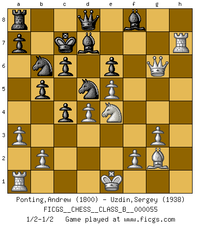 Last move : 1/2-1/2 2008 October 14 0:26:28 [Event "FICGS__CHESS__CLASS_B__000055"] [Site "FICGS"] [Date "2008.09.02"] [Round "1"] [White "Ponting,Andrew"] [Black "Uzdin,Sergey"] [Result "1/2-1/2"] [WhiteElo "1800"] [BlackElo "1938"] 1.d4 d5 2.c4 e6 3.Nf3 Nf6 4.Nc3 c6 5.Bg5 dxc4 6.e4 b5 7.e5 h6 8.Bh4 g5 9.Nxg5 hxg5 10.Bxg5 Nbd7 11.g3 Rg8 12.h4 Rxg5 13.hxg5 Nd5 14.g6 fxg6 15.Qg4 Qe7 16.Qxg6+ Kd8 17.Bg2 Qb4 18.Qc2 N7b6 19.a3 Qe7 20.Qg6 Qe8 21.Qg5+ Kc7 22.Rh7+ Bd7 23.Ne4 Qd8 24.Qg6 Qe8 25.Qg5 Qd8 26.Qg6 1/2-1/2 Queen's gambit declined This chess game ended in a draw. Follow this game move after move (download)I feel as if I were a piece in a game of Chess, when my opponent says of it: That piece cannot be moved. (Soren Kierkegaard) Kritik überlasse ich den Spießern. Ich zeige nichts, wofür ich mich schämen muss. (Alexandra Kosteniuk) El pensamiento metódico es mas útil en el Ajedrez que la inspiración. (C. J. S. Purdy) En blitz, le Cavalier l'emporte sur le Fou. (Vlastimil Hort) Inventor: A person who makes an ingenious arrangement of wheels, levers and springs, and believes it civilization. (Ambrose Bierce, The Devil's Dictionary)