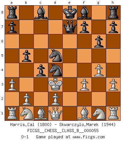 Last move : 0-1 2008 September 24 23:56:47 [Event "FICGS__CHESS__CLASS_B__000055"] [Site "FICGS"] [Date "2008.09.02"] [Round "1"] [White "Harris,Cal"] [Black "Skwarczylo,Marek"] [Result "0-1"] [WhiteElo "1800"] [BlackElo "1944"] 1.e4 c5 2.c4 Nc6 3.g4 g6 4.f3 e6 5.a3 Qh4+ 6.Ke2 Nd4+ 7.Ke3 d5 8.cxd5 exd5 9.exd5 Nf6 10.h3 Nxd5+ 11.Ke4 Qe7+ 12.Kd3 Nf4+ 13.Kc4 b5+ 14.Kc3 Nd5+ 15.Kd3 c4+ 0-1 Sicilian defense Player Black won this chess game. Follow this game move after move (download)The essence of Chess is thinking about what Chess is. (David Bronstein) Ich habe Kasparov in Rente geschickt. (Veselin Topalov) Vive, pierde y aprende al observar a tu oponente como gana. (Amber Steenbock) Aidez vos pièces, elles vous aideront. (Paul Morphy) If you are going through hell, keep going. (Winston Churchill)