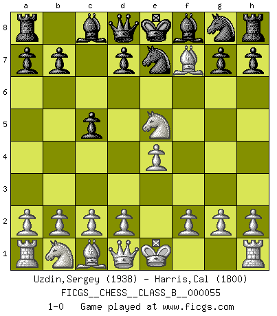 Last move : 1-0 2008 September 22 23:53:20 [Event "FICGS__CHESS__CLASS_B__000055"] [Site "FICGS"] [Date "2008.09.02"] [Round "1"] [White "Uzdin,Sergey"] [Black "Harris,Cal"] [Result "1-0"] [WhiteElo "1938"] [BlackElo "1800"] 1.e4 e5 2.Nf3 Nc6 3.Bb5 Nce7 4.Nxe5 c6 5.Bc4 c5 6.Bxf7+ 1-0 Ruy Lopez (Spanish Opening) Player White won this chess game. Follow this game move after move (download)Strategy requires thought, tactics require observation. (Max Euwe) Schach ist gnadenlos. Du mußt bereit sein zu töten. (Nigel Short) Un jugador que es sorprendido, esta derrotado a medias. (Proverbio) Vous n'êtes pas toujours obligé de jouer le meilleur coup. Un coup doit être actif, entreprenant, correct et beau ! (David Bronstein) Philosophers use a language that is already deformed as though by shoes that are too tight. (Ludwig Wittgenstein)