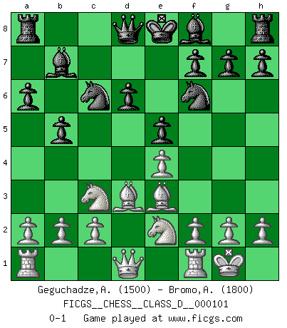 Last move : 0-1 2008 October 23 0:34:17 [Event "FICGS__CHESS__CLASS_D__000101"] [Site "FICGS"] [Date "2008.09.02"] [Round "1"] [White "Geguchadze,Alexander"] [Black "Bromo,Alexis"] [Result "0-1"] [WhiteElo "1500"] [BlackElo "1800"] 1.e4 c5 2.Nf3 d6 3.d4 cxd4 4.Nxd4 Nf6 5.Nc3 a6 6.Be3 Nc6 7.Bd3 e5 8.Nde2 b5 9.O-O Bb7 0-1 This chess game has been lost on time (started : 2008.09.02 5:17:17) Sicilian : Najdorf, Byrne (English) attack Kingside Castling by player White (move 9) Player Black won this chess game. Follow this game move after move (download)First-class players lose to second class players because second-class players sometimes play a first-class game. (Tarrasch) Der Schachmeister von Heute braucht Courage, einen Killerinstinkt, Ausdauer und Arroganz. (Larry Evans) Ciertamente, de todas la drogas del mundo, el Ajedrez debe ser el mas placentero permamentemente. (Assiac) Il a essayé de se convaincre qu'il pourrait empêcher toutes les erreurs et ne jamais perdre. L'horreur ! Gary Kasparov au sujet de Robert Fischer. In theory there is no difference between theory and practice. In practice there is. (Yogi Berra)