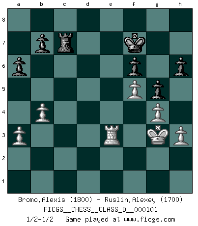 Last move : 1/2-1/2 2008 December 5 6:21:32 [Event "FICGS__CHESS__CLASS_D__000101"] [Site "FICGS"] [Date "2008.09.02"] [Round "1"] [White "Bromo,Alexis"] [Black "Ruslin,Alexey"] [Result "1/2-1/2"] [WhiteElo "1800"] [BlackElo "1700"] 1.e4 c6 2.d4 d5 3.exd5 cxd5 4.Nf3 Bg4 5.Be2 Nc6 6.c3 e6 7.O-O Bd6 8.Bg5 Nge7 9.Re1 O-O 10.Nbd2 h6 11.Bh4 Qc7 12.Bg3 Nf5 13.Bxd6 Qxd6 14.h3 Bxf3 15.Nxf3 a6 16.b4 Rac8 17.Bd3 Nce7 18.Rc1 Rc7 19.Re2 Rfc8 20.Rec2 f6 21.g4 Nxd4 22.Nxd4 e5 23.Nf5 Nxf5 24.Bxf5 Rd8 25.Kg2 Kf7 26.a3 g6 27.Bd3 e4 28.Be2 Qe5 29.f3 Rdc8 30.Qd2 g5 31.c4 d4 32.Bf1 d3 33.Bxd3 exd3 34.Qxd3 Kg7 35.Re2 Qf4 36.Rce1 Rf7 37.Re7 Qxc4 38.Qxc4 Rxc4 39.R1e3 Rc2+ 40.Kg3 Kg6 41.Rxf7 Kxf7 42.f4 Rc7 43.f5 1/2-1/2 Caro-Kann : Exchange variation Kingside Castling by player White (move 7) Kingside Castling by player Black (move 9) This chess game ended in a draw. Follow this game move after move (download)With or without the title, Bobby Fischer was unquestionably the greatest player of his time. (Burt Hochberg) Ich kenne Menschen, die allen Willen der Welt besitzen und doch nicht Schach spielen können. (Robert James Fischer) Una partida de Ajedrez se divide en 3 etapas: la primera cuando piensas que tienes la ventaja, la segunda cuando crees que tienes la ventaja y la tercera... ¡cuando te das cuenta que vas a perder!. (Savielly Tartakower) La guerre est enfant de la passion, la passion est enfant du narcissisme et le narcissisme est l'enfant. (...) Une autre partie ? (Thibault de Vassal) Those who make the worst use of their time are the first to complain of its brevity. (Jean de la Bruyere)