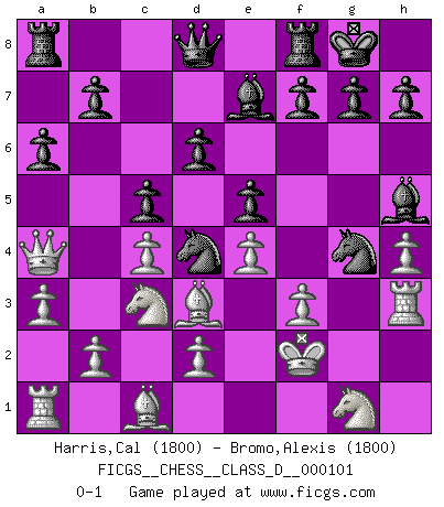 Last move : 0-1 2008 December 10 2:5:12 [Event "FICGS__CHESS__CLASS_D__000101"] [Site "FICGS"] [Date "2008.09.02"] [Round "1"] [White "Harris,Cal"] [Black "Bromo,Alexis"] [Result "0-1"] [WhiteElo "1800"] [BlackElo "1800"] 1.e4 c5 2.c4 Nc6 3.g4 d6 4.Qa4 Bxg4 5.f3 Bh5 6.Be2 Nf6 7.h4 e5 8.Nc3 Be7 9.Rh3 O-O 10.a3 Nd4 11.Bd3 a6 12.Kf2 Ng4+ 0-1 This chess game has been lost on time (started : 2008.09.02 5:17:17) Sicilian defense Kingside Castling by player Black (move 9) Player Black won this chess game. Follow this game move after move (download)A good player is always lucky. (Jose Raul Capablanca) Wenn Du absolut nicht mehr weißt, was Du tun sollst, dann ist es Zeit für Panik. (John van der Wiel) ¿Porque tengo que perder ante este idiota?. (Aron Nimzovich) Le pion, dans sa simplicité, marche droit devant lui, mais lorsqu'il prend, il le fait obliquement? Ainsi l'homme, tant qu'il reste pauvre, marche dans la droiture et vit honnêtement, mais lorsqu'il recherche les honneurs, il flatte, se parjure et, par les voies obliques, cherche une position supérieure sur l'échiquier du monde. (Jean de Galles) That's absurd. I love it. (Gregory House, House M.D.)