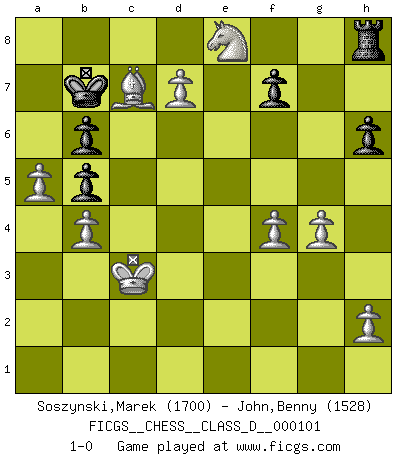Last move : 1-0 2009 April 13 21:53:2 [Event "FICGS__CHESS__CLASS_D__000101"] [Site "FICGS"] [Date "2008.09.02"] [Round "1"] [White "Soszynski,Marek"] [Black "John,Benny"] [Result "1-0"] [WhiteElo "1700"] [BlackElo "1528"] 1.Nf3 e6 2.d3 Bc5 3.d4 Bb6 4.Bg5 Ne7 5.e3 h6 6.Bh4 O-O 7.Bd3 Qe8 8.O-O Nf5 9.Bxf5 exf5 10.c4 d6 11.Nc3 Be6 12.b3 Na6 13.a3 Qd7 14.d5 Rfe8 15.dxe6 Qxe6 16.Qd5 Qxd5 17.Nxd5 Nc5 18.Rab1 Ne4 19.Nd4 Nd2 20.Nxb6 axb6 21.Nb5 Rec8 22.Rbc1 Nxf1 23.Kxf1 Kf8 24.a4 Ke8 25.Rd1 Kd7 26.f3 Re8 27.Rd3 g5 28.Be1 Re5 29.Bc3 Re6 30.Nd4 Rf6 31.Ne2 Re6 32.Ng3 f4 33.exf4 gxf4 34.Nh5 Re3 35.Nf6+ Ke6 36.Rxe3+ fxe3 37.Nd5 Kd7 38.g4 Kc6 39.Nxe3 Kc5 40.Ke2 Rg8 41.Nd5 Re8+ 42.Kd3 Kc6 43.f4 Ra8 44.Nf6 Rd8 45.Bd4 d5 46.cxd5+ Kd6 47.Be5+ Kc5 48.Kc3 b5 49.b4+ Kb6 50.a5+ Ka6 51.Bxc7 Rh8 52.d6 b6 53.d7 Kb7 54.Ne8 1-0 Reti Opening Kingside Castling by player Black (move 6) Kingside Castling by player White (move 8) Player White won this chess game. Follow this game move after move (download)Life is a kind of Chess, with struggle, competition, good and ill events. (Benjamin Franklin) Glücklicherweise sind Großmeister Ruben Fines reine Schachbücher weniger phallozentrisch [als seine Schachpsychologie] und deswegen auch weniger lächerlich. (Nigel Short) ¿Que sería del Ajedrez sin errores graciosos?. (Kurt Richter) Les Echecs représentent une sphère d'idées créatrices basée sur la volonté des deux protagonistes. (Smyslov) Hold em is to stud what chess is to checkers. (Johnny Moss)