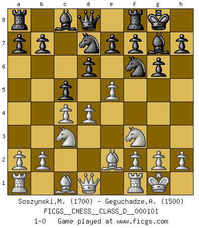 Last move : 1-0 2008 October 20 12:20:9 [Event "FICGS__CHESS__CLASS_D__000101"] [Site "FICGS"] [Date "2008.09.02"] [Round "1"] [White "Soszynski,Marek"] [Black "Geguchadze,Alexander"] [Result "1-0"] [WhiteElo "1700"] [BlackElo "1500"] 1.d4 Nf6 2.c4 d6 3.Nc3 g6 4.e4 Bg7 5.Be2 Nbd7 6.Nf3 O-O 7.O-O c5 8.e5 1-0 This chess game has been lost on time (started : 2008.09.02 5:17:17) Old Indian defense Kingside Castling by player Black (move 6) Kingside Castling by player White (move 7) Player White won this chess game. Follow this game move after move (download)Checkers is for tramps. (Paul Morphy) Man wirke der falschen Auffassung entgegen, als ob jeder Zug Unmittelbares zu leisten habe; auch Werte- und Ruhezüge haben ihre Existenzberechtigung. (Aaron Nimzowitsch) No puedes jugar al Ajedrez si eres de corazón noble. (Proverbio Francés) Psychologiquement, tu dois avoir confiance en toi même, mais cette confiance doit être basée sur des faits. (Robert Fischer) Over-the-board chess is the favorite of mortals, correspondence chess is the favorite of the gods. (Eduard Dyckhoff)