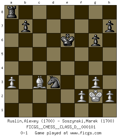 Last move : 0-1 2008 October 8 18:10:37 [Event "FICGS__CHESS__CLASS_D__000101"] [Site "FICGS"] [Date "2008.09.02"] [Round "1"] [White "Ruslin,Alexey"] [Black "Soszynski,Marek"] [Result "0-1"] [WhiteElo "1700"] [BlackElo "1700"] 1.d4 d5 2.Nf3 Nf6 3.Bf4 c5 4.e3 Nc6 5.c3 Qb6 6.Qc2 Bf5 7.Qb3 e6 8.Nbd2 c4 9.Qxb6 axb6 10.Be2 b5 11.O-O b4 12.Nh4 Ne4 13.Nxe4 Bxe4 14.Nf3 bxc3 15.bxc3 Ba3 16.Nd2 Bc2 17.Bd1 Bg6 18.Bf3 Bd3 19.Rfe1 Bb2 20.e4 Bxc3 21.exd5 Nxd4 22.dxe6 Bxa1 23.exf7+ Kxf7 24.Bd5+ Kf6 25.Be5+ Kg6 26.Rxa1 Ne2+ 27.Kh1 Ra5 28.Bxc4 Bxc4 29.Nxc4 Rc5 30.Re1 Rxc4 31.g3 Rc1 32.Rxc1 Nxc1 33.a3 Ra8 34.Bd6 Kf5 35.Kg2 Ke6 36.Bb4 Nd3 37.Bc3 g6 0-1 Queen's Bishop game Kingside Castling by player White (move 11) Player Black won this chess game. Follow this game move after move (download)Becoming successful at Chess allows you to discover your own personality. That's what I want for the kids I teach. (Saudin Robovic) Die größte Kunst beim Schach besteht darin dem Gegner nicht zu zeigen was er tun kann. (Garry Kasparov) Una clavada es mas poderosa que una espada. (Fred Reinfeld) Dans le domaine de la peinture, de la gravure et de la sculpture, dès la première décennie de notre siècle, les artistes abandonnent la représentation de la partie d'échecs pour se concentrer sur les pièces, sur les échiquiers et sur toutes les variations auxquelles les unes et les autres peuvent donner lieu. On passe en quelque sorte d'un thème social à un thème musical (au sens de la musica médiévale, c'est-à-dire d'une notion qui inclue le rythme, l'harmonie, la construction et la déconstruction, etc.). Graphiquement et picturalement, l'échiquier apparaît comme une structure ouverte, dynamique, d'une richesse infinie, autorisant toutes les combinatoires et débouchant sur des mouvements et des rythmes de nature exponentielle. (Michel Pastoureau) A cynic is a man who knows the price of everything but the value of nothing. (Oscar Wilde)